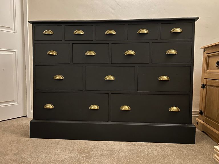 Black solid glass dressing table, mirror and stool with velvet top. 2 Wide drawers in front. Solid mirror with 3 sections sits on top. It's wood with a glass finish.