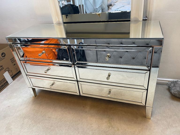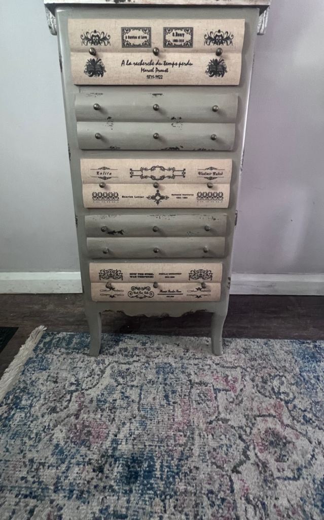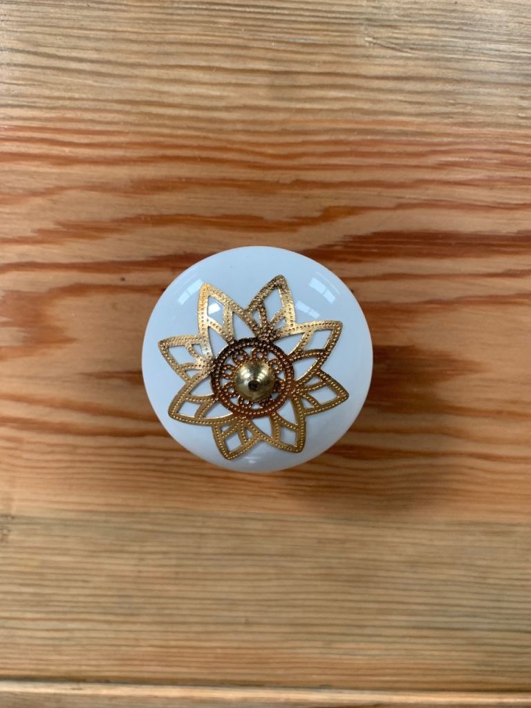 This unique piece features a striking natural grain and a rustic, warm finish. Each drawer is accented with decorative white and gold ceramic knobs for a touch of elegance. Ideal for a bedroom, hallway, or as a statement storage piece.(923)
