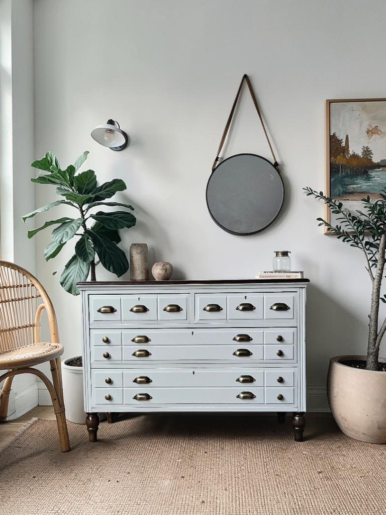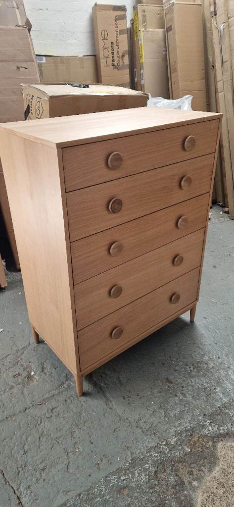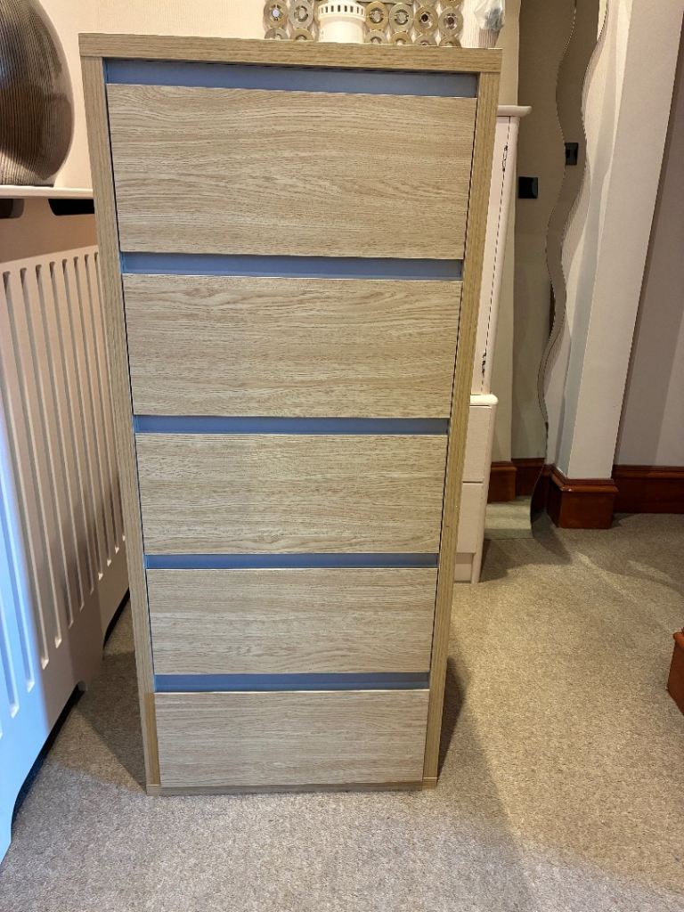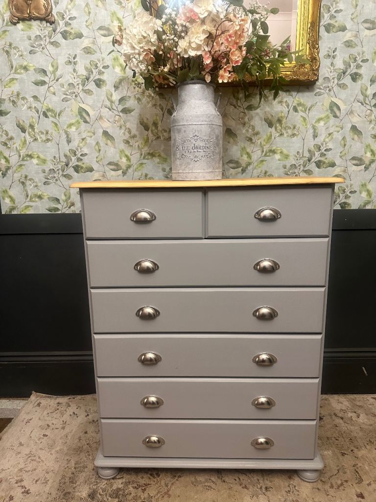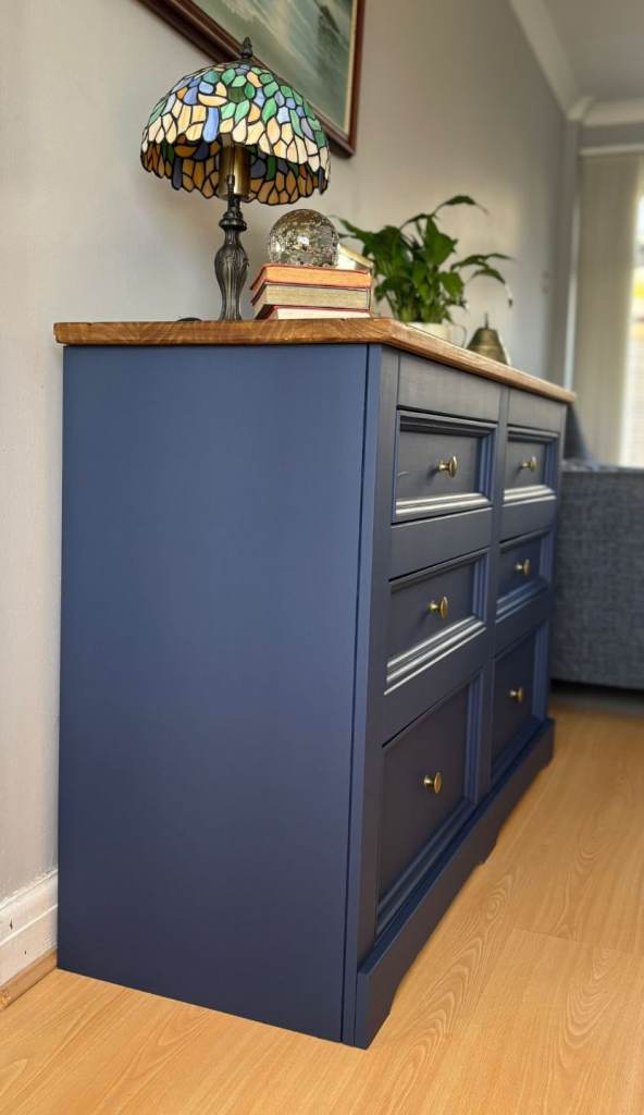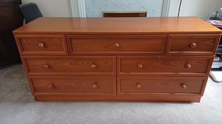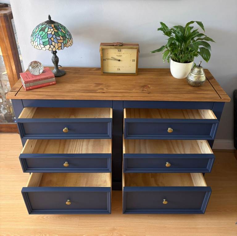 Large solid wood chest of drawers in excellent condition. Navy blue in colour. All drawers work perfectly and have dovetailed joints. Height 33 x Width 52 x Depth 17 inches. Will need two people to collect as a heavy piece of furniture. Collect Langstone Np18