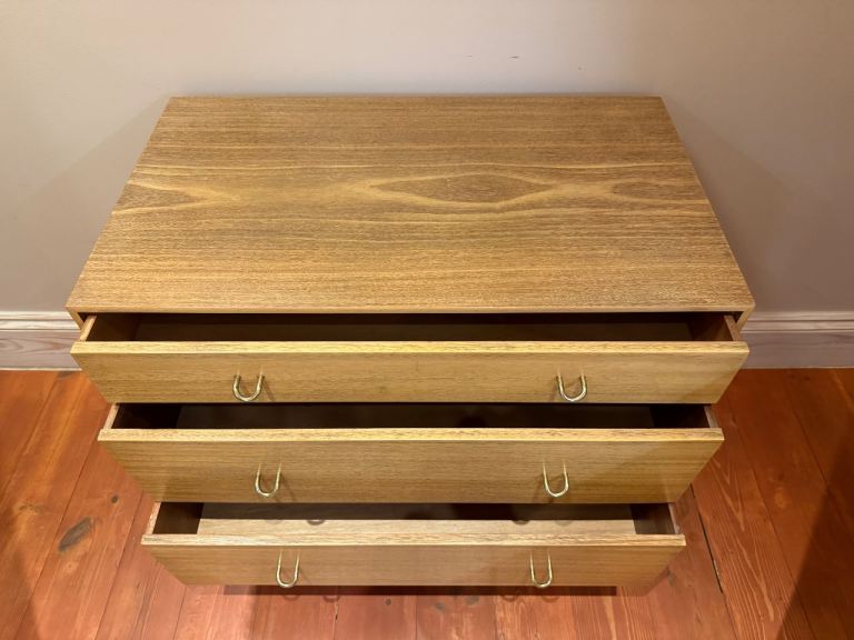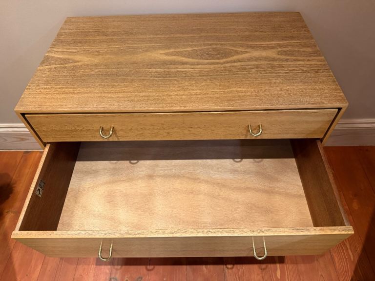 A very stylish and scarcely seen 1950s oak chest of drawers designed by John & Sylvia Reid for Stag Furniture.