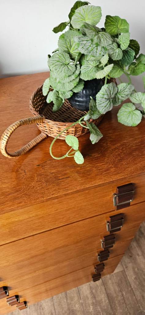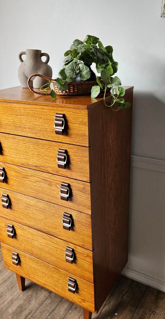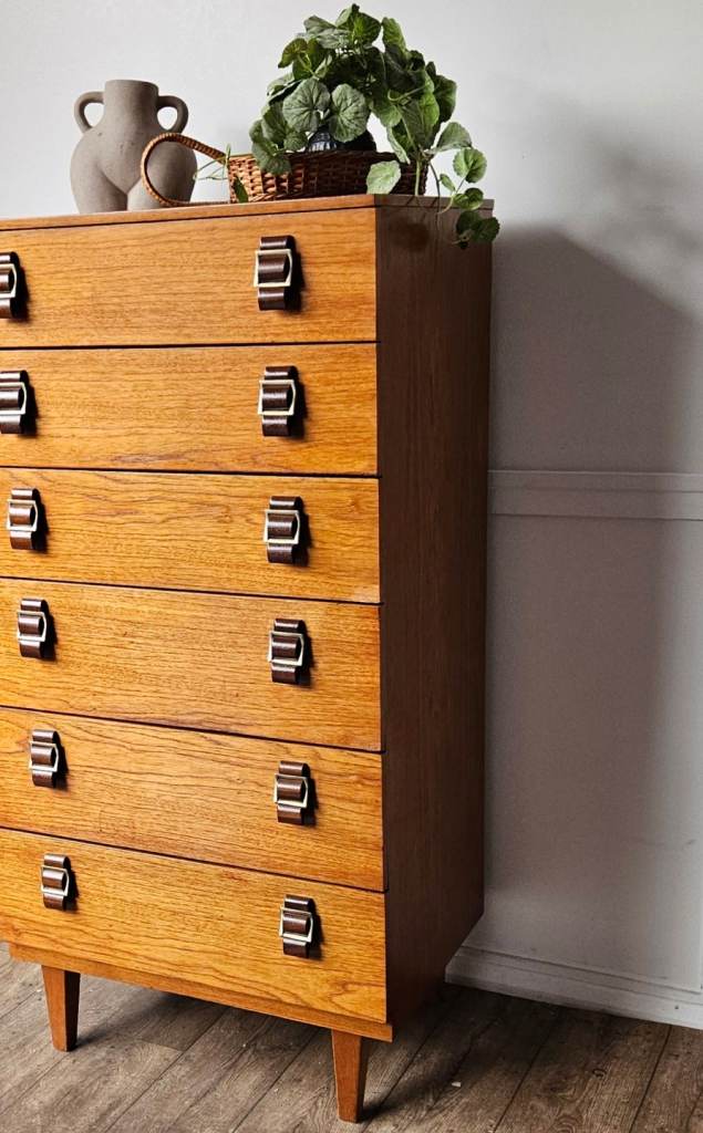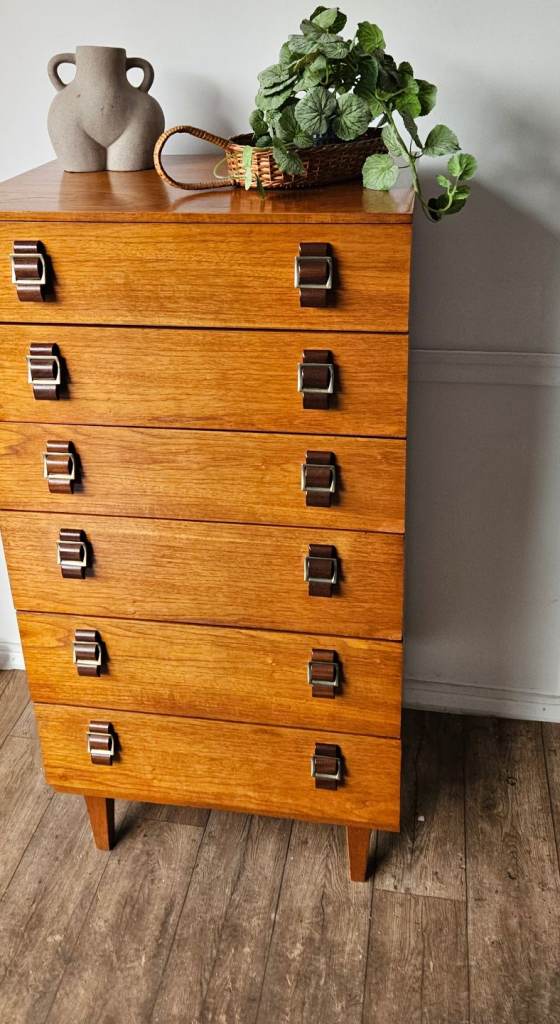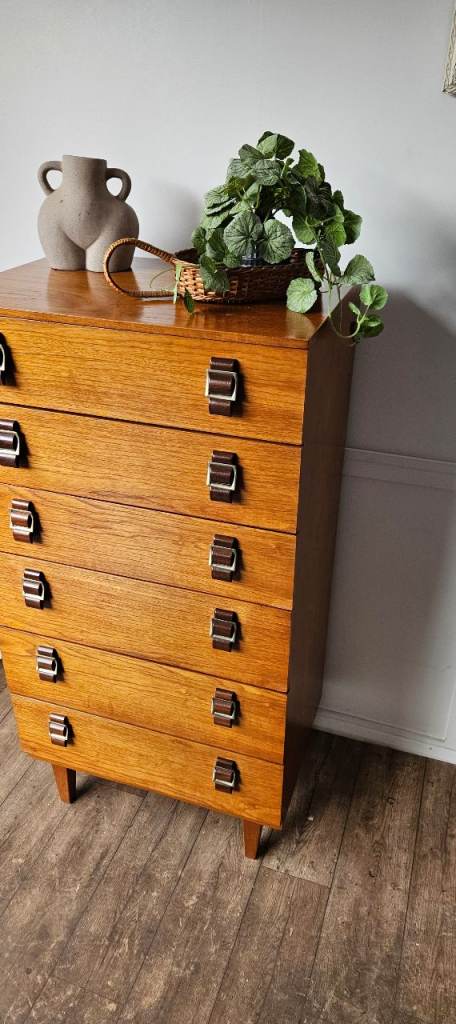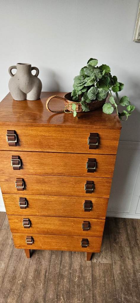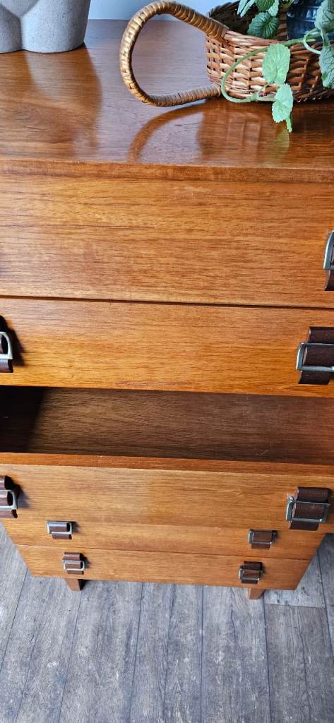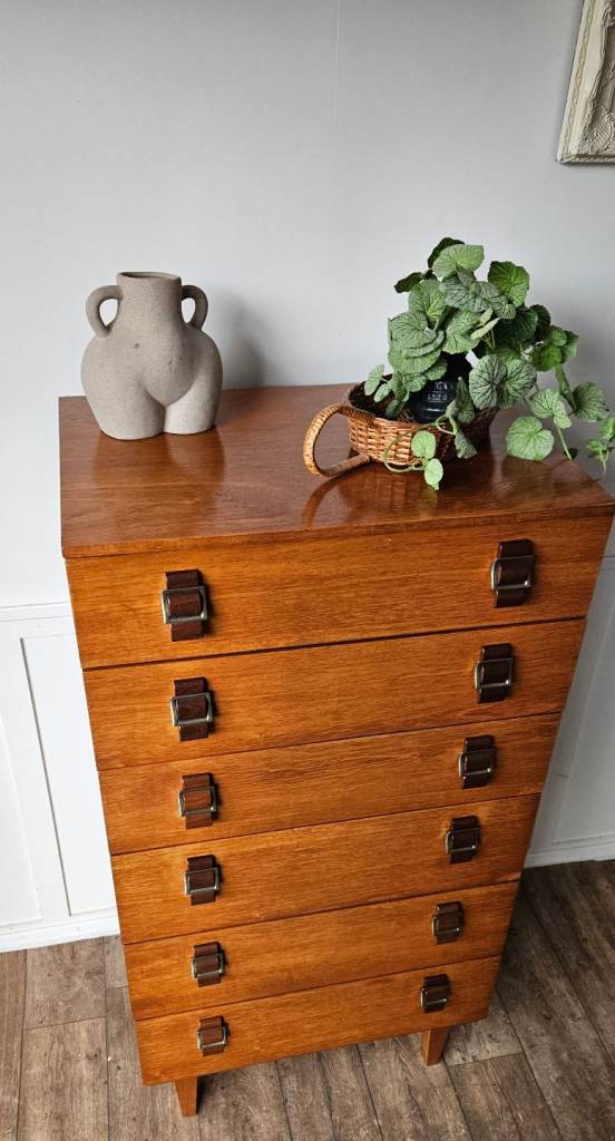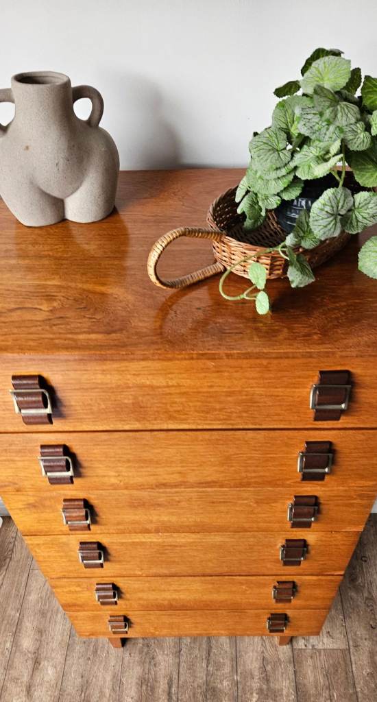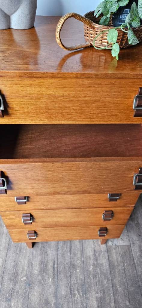 A gorgeous original mid-century chest of drawers crafted in rich teak, showcasing beautiful warm tones and classic clean lines. This striking piece features elegant brass-style handles that perfectly complement the wood, giving it that timeless mid-century modern appeal.