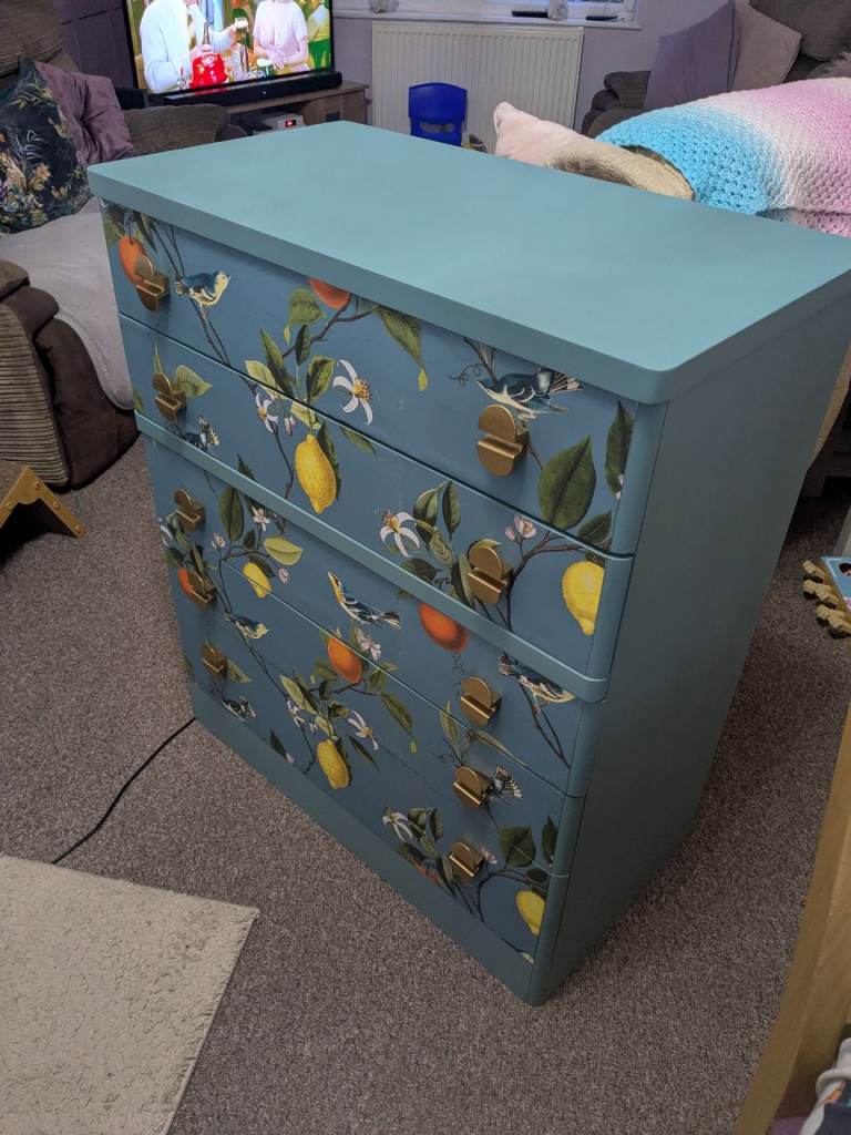 This is a lovely upcycled chest of drawers in a green, wallpaper on the front. Very heavy and solid.