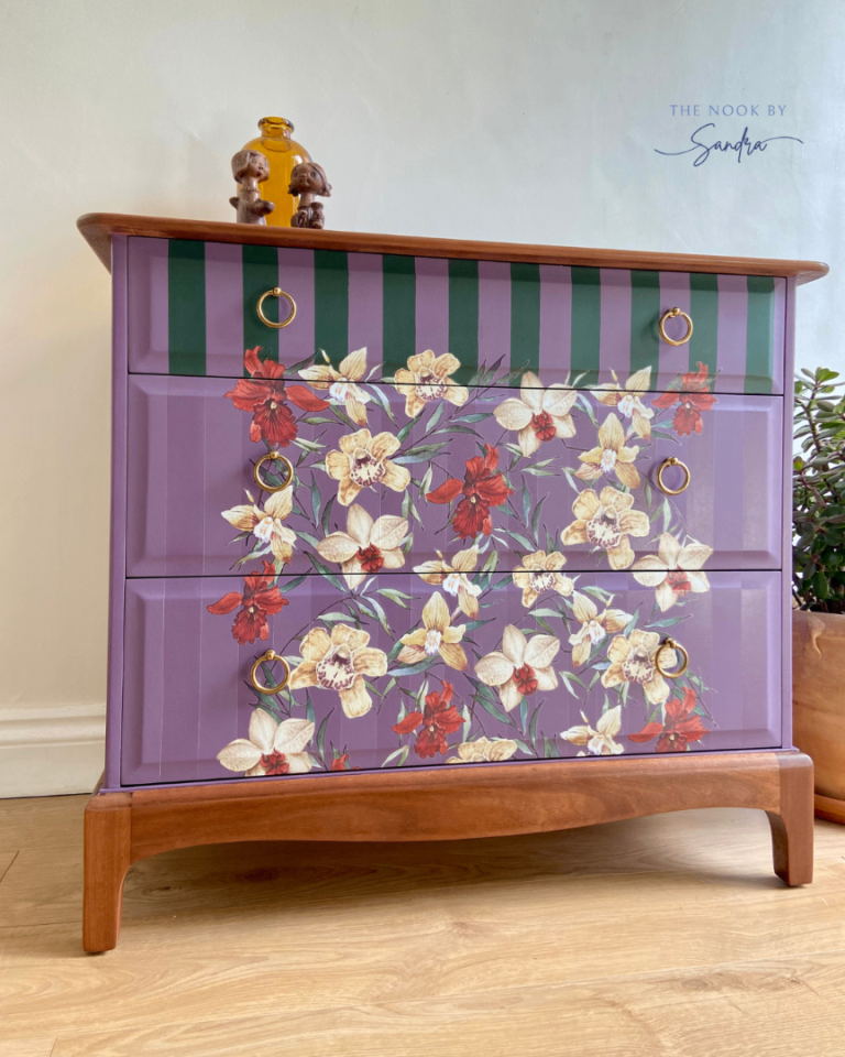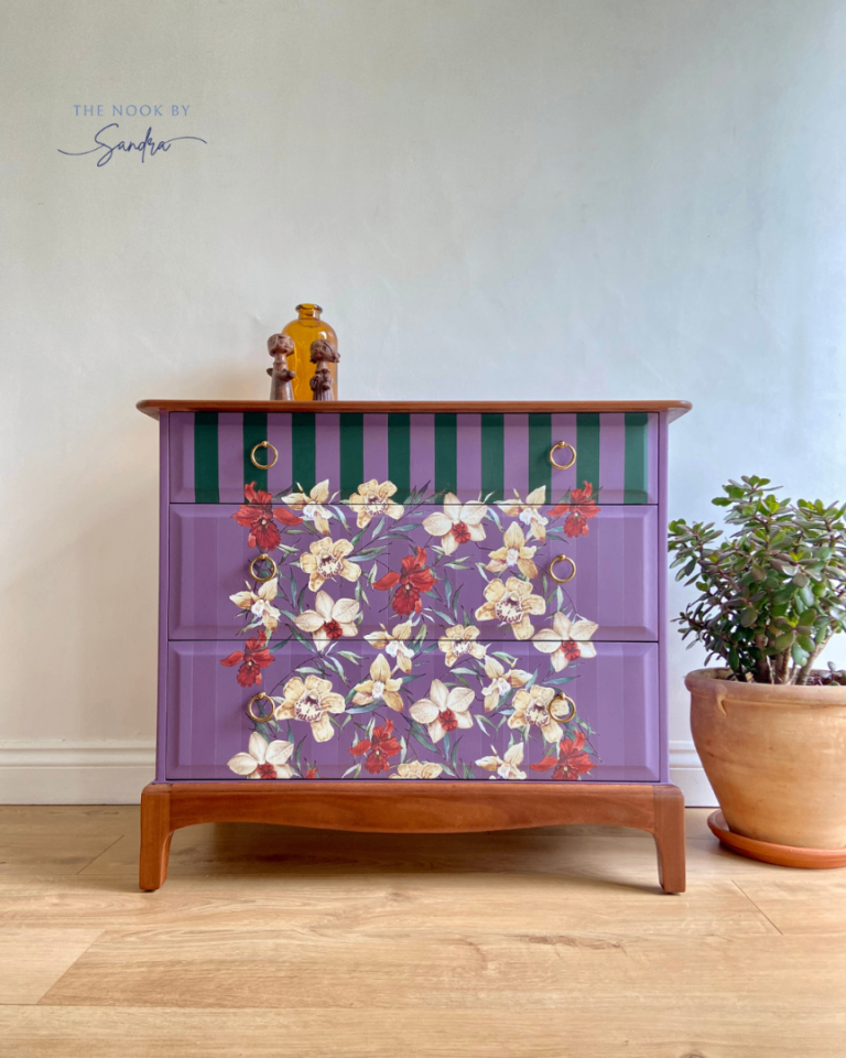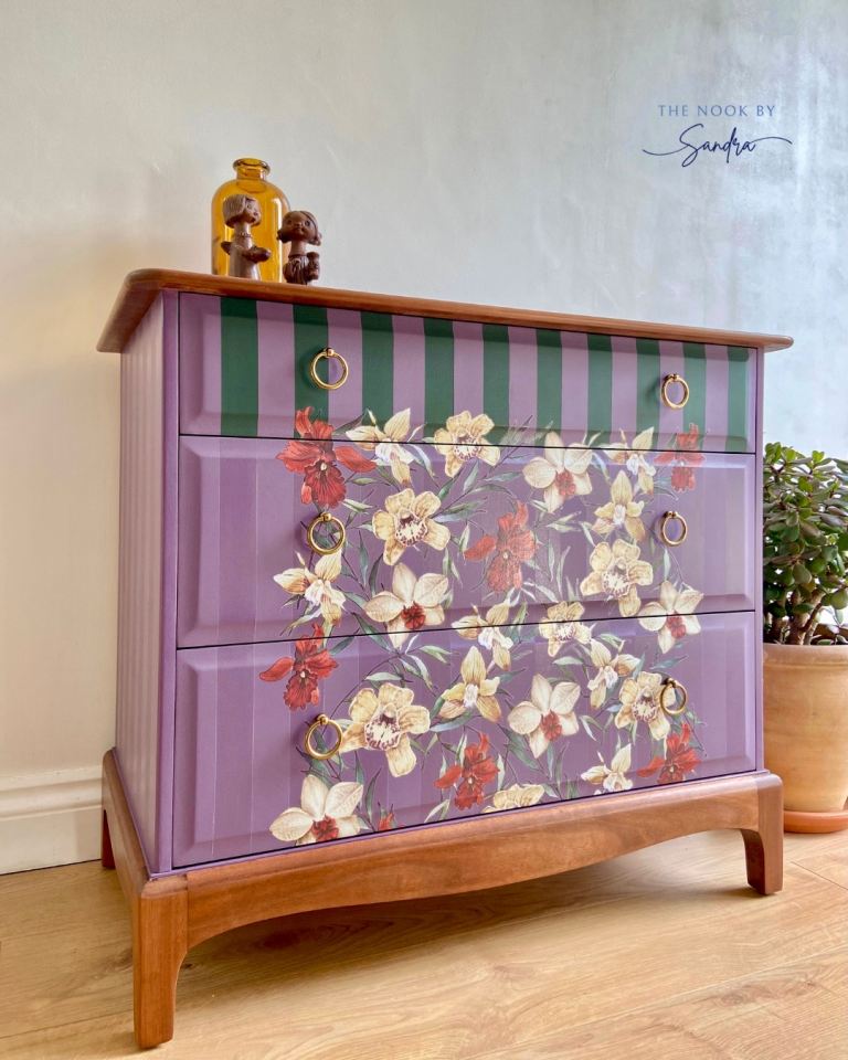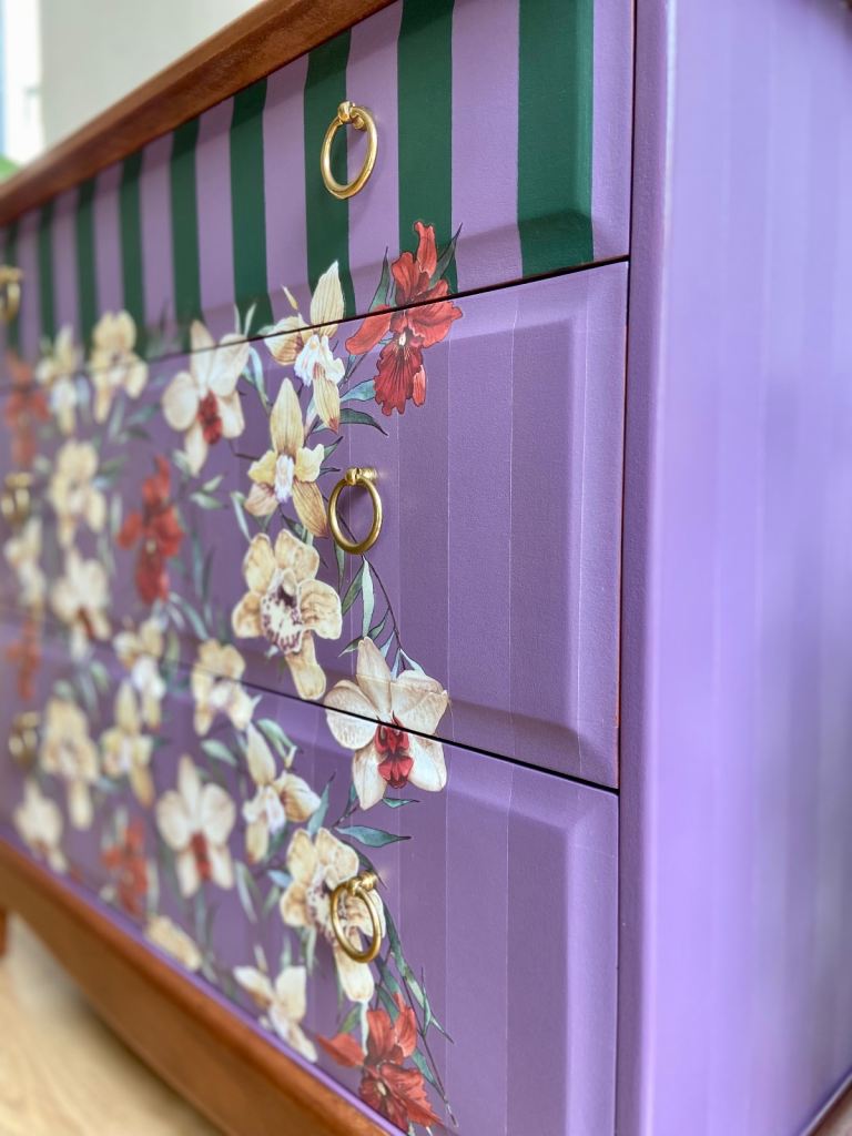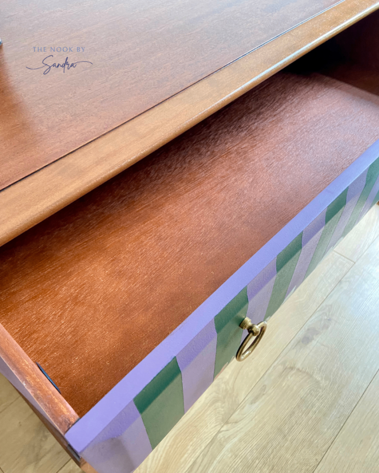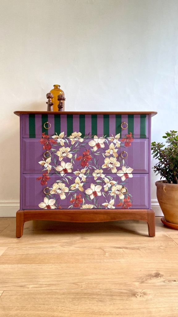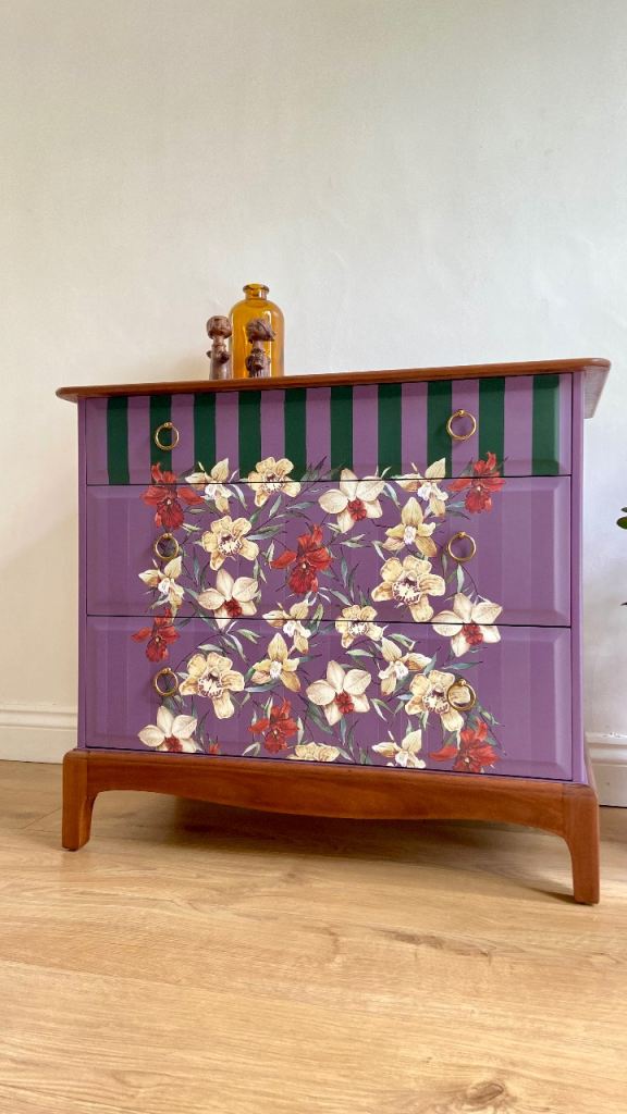 Each section of this Stag Minstrel chest has been meticulously restored, sanded, primed, and hand-painted with premium-quality furniture paint known for its velvety-smooth finish and lasting durability. The combination of deep, dusky mauve and deep green stripes creates a harmonious contrast that highlights the dresser’s original lines and elegant structure.