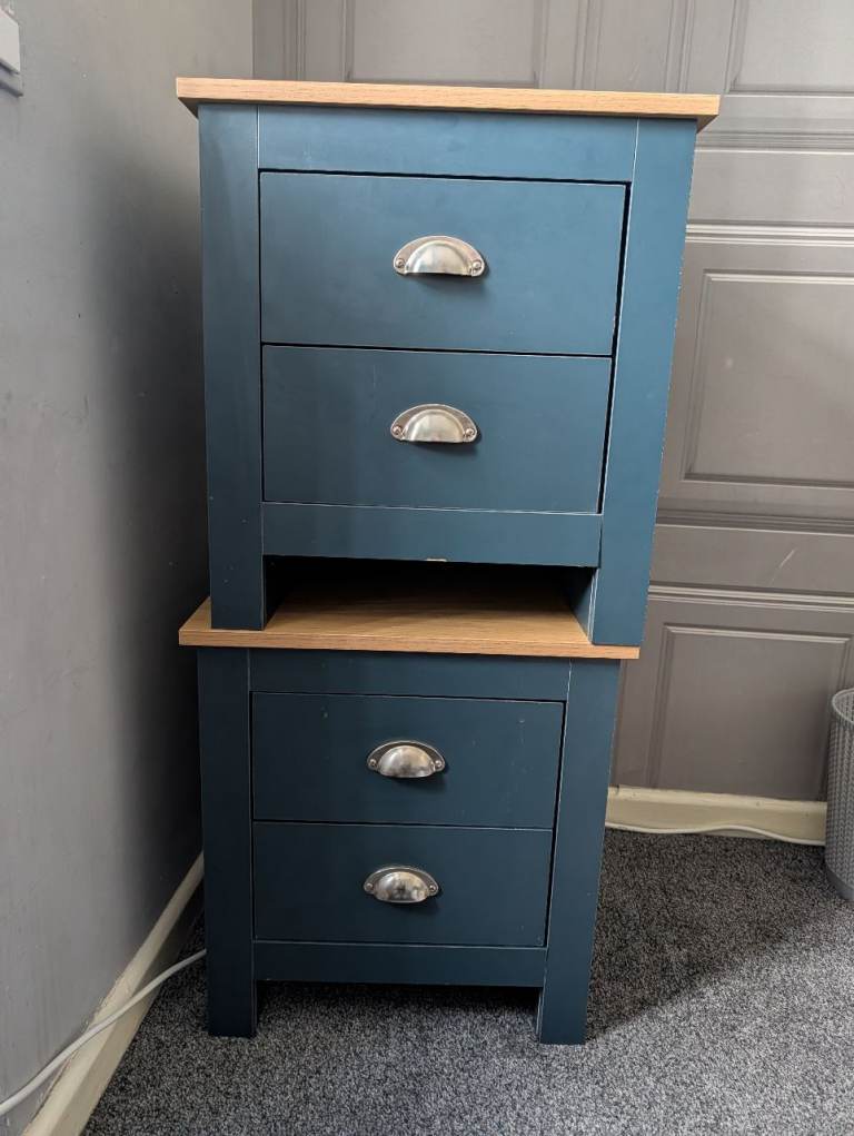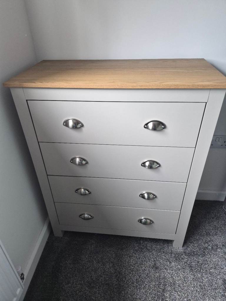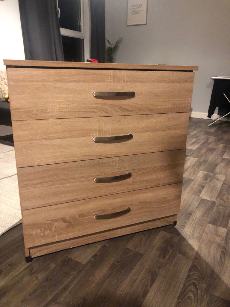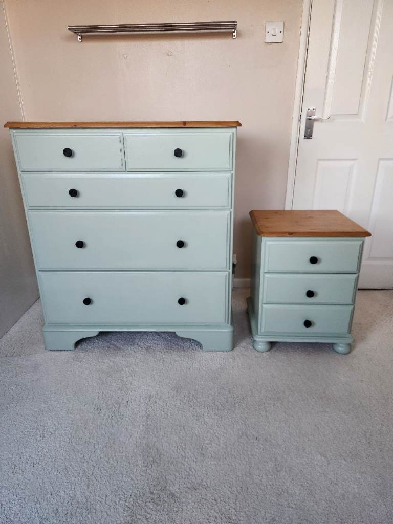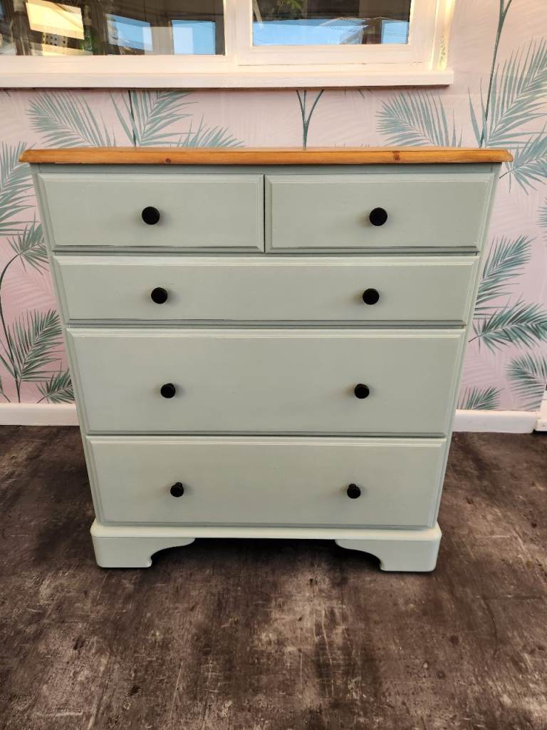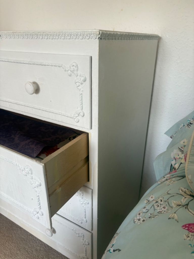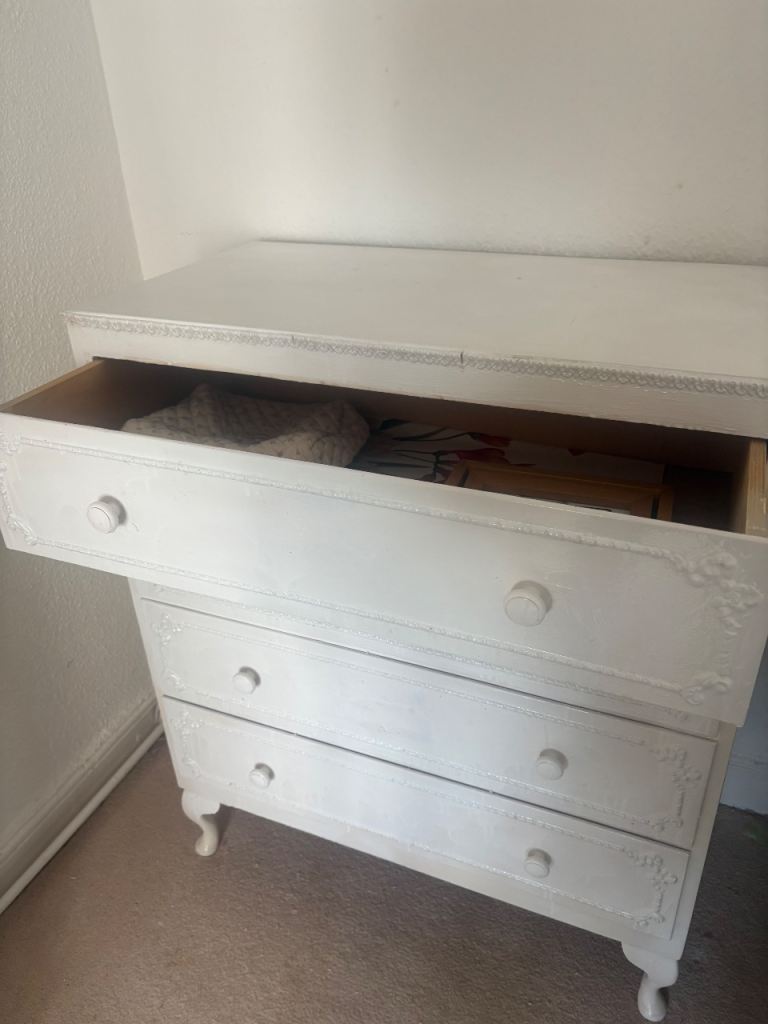 Wooden chest of drawers in shabby chique style. Nice deep drawers . Solid piece of furniture. Not flat packed