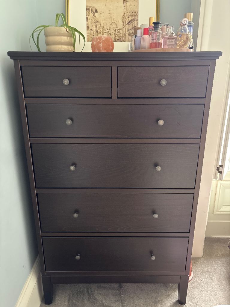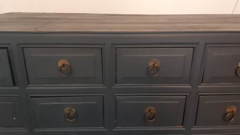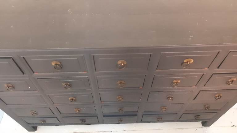 Wooden chest of drawers painted dark grey.Brass handles.