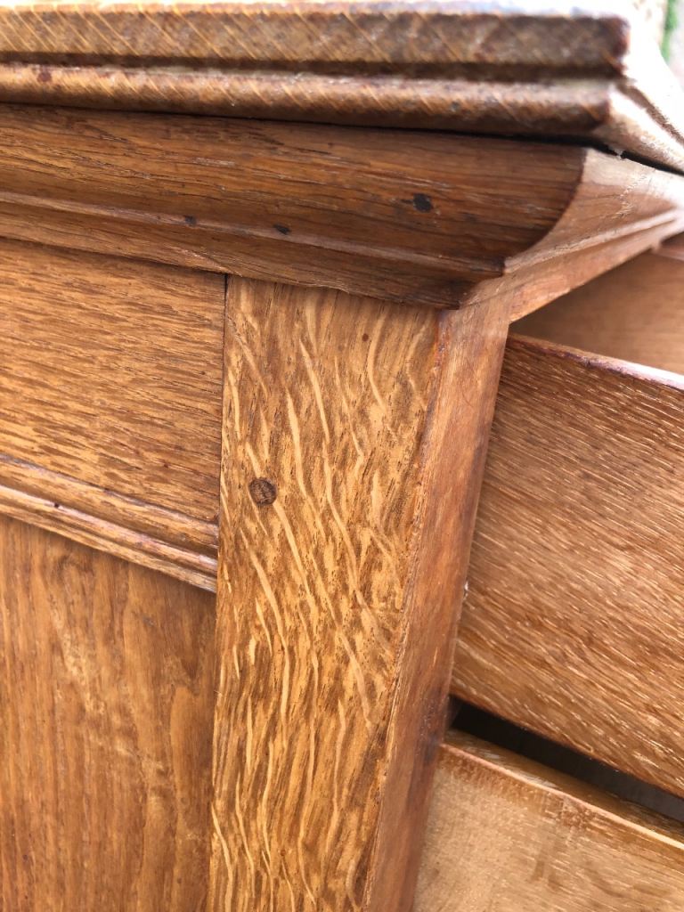 Hand-crafted from solid oak, it features a classic arrangement of five drawers, dovetail joints, beautifully detailed with traditional geometric panel mouldings—a signature of the period—and retain their original brass teardrop handles.