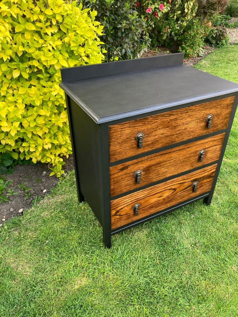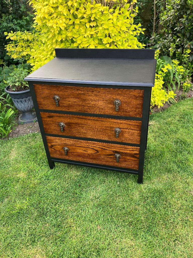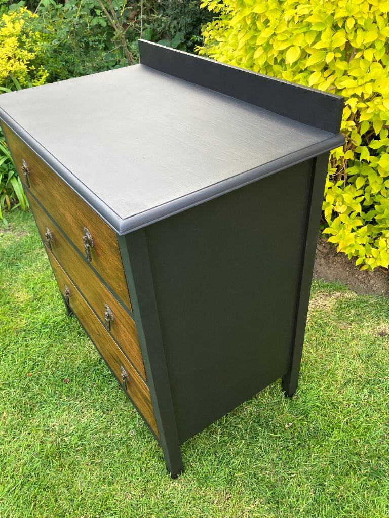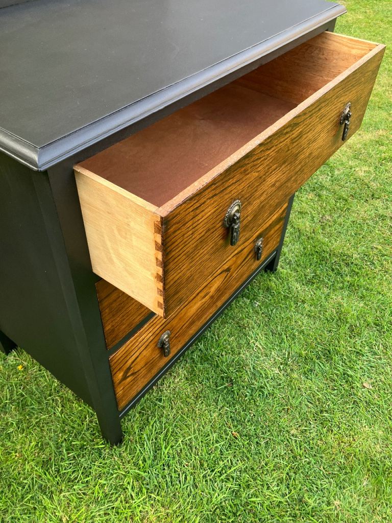 Newly painted in” liberty flat Matt”, with original antique drawer handles. Drawers coated in beeswax. Measures height 77cm, width 77cm, depth 46cm. Collection from Wroxham.