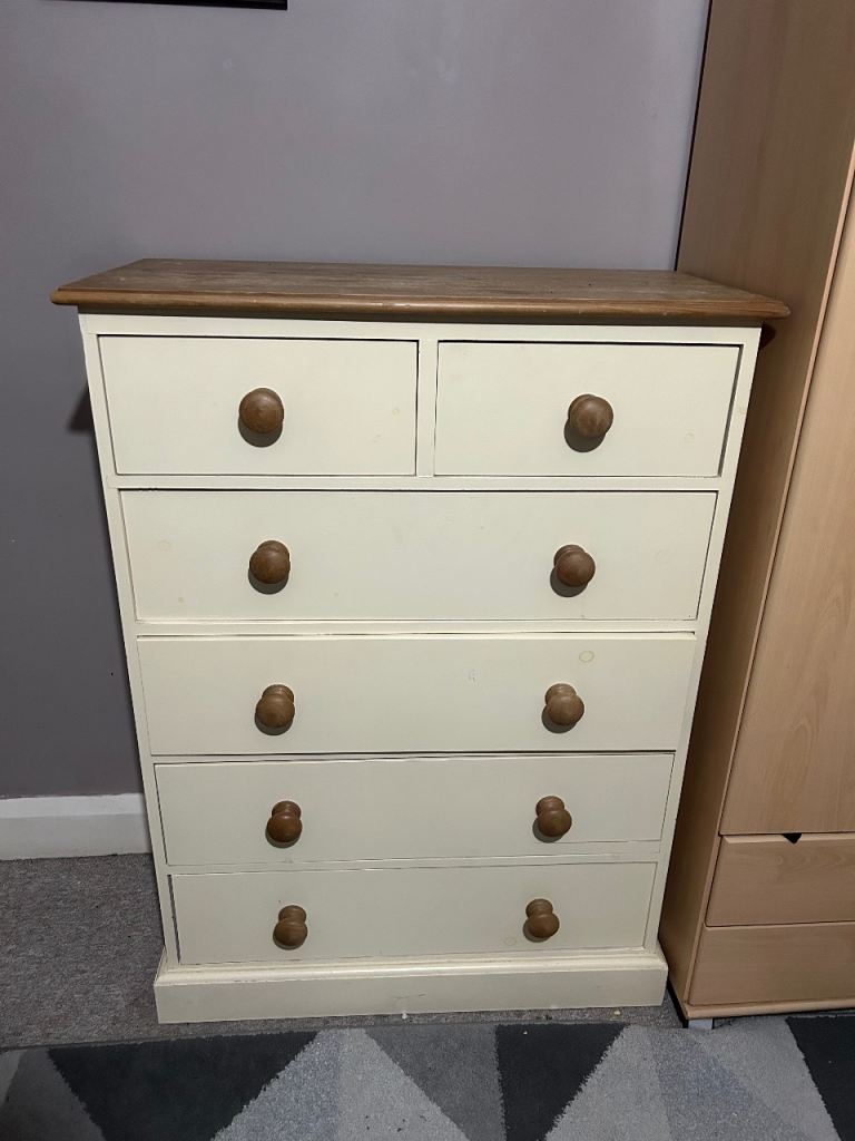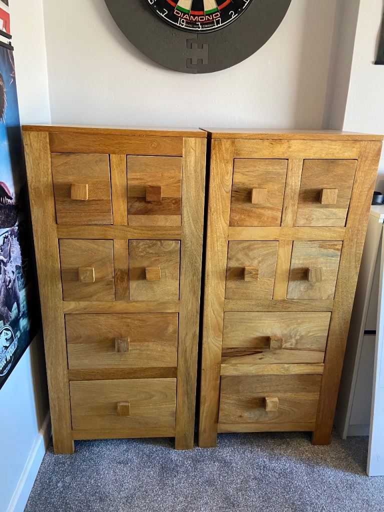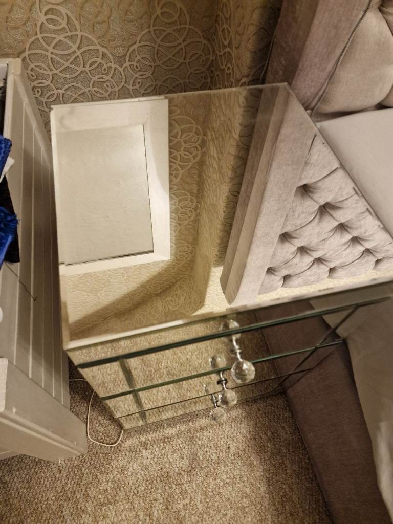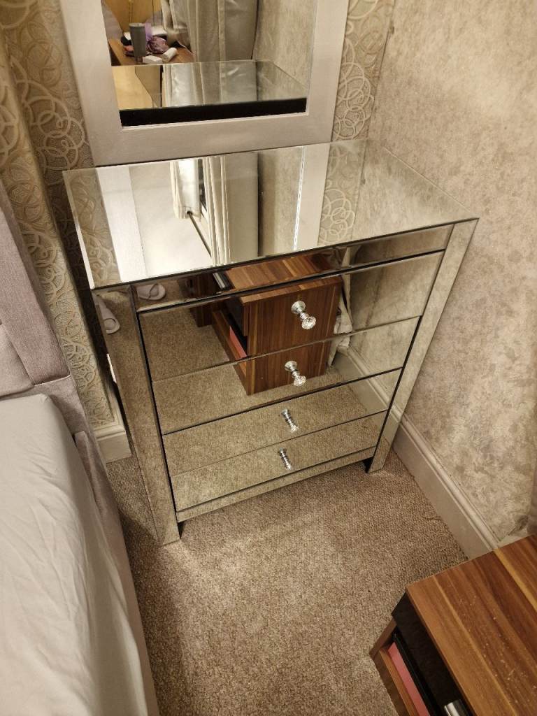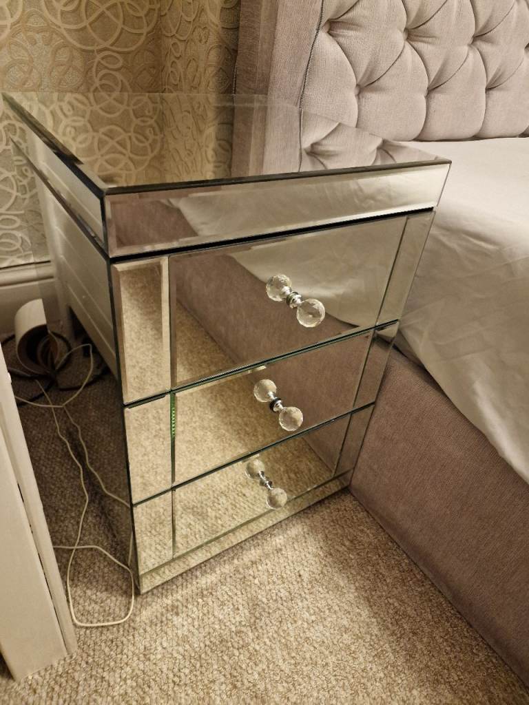 Venetian mirrored chest of drawers with matching night stand in excellent condition. Includes mirrored glass panels with bevelled edges and crystal glass handles. Smoke and pet free home.