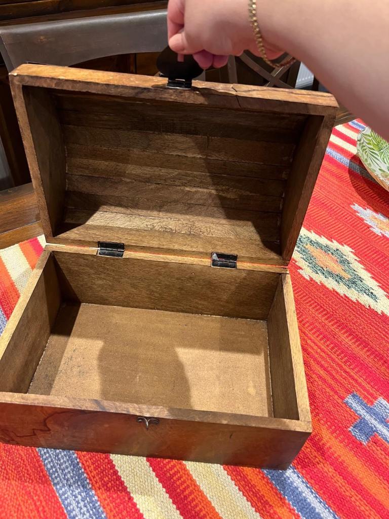 Solid wooden chest, ideal for storing trinkets or as a decorative piece.