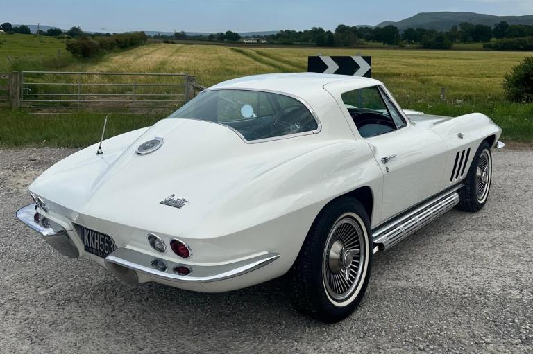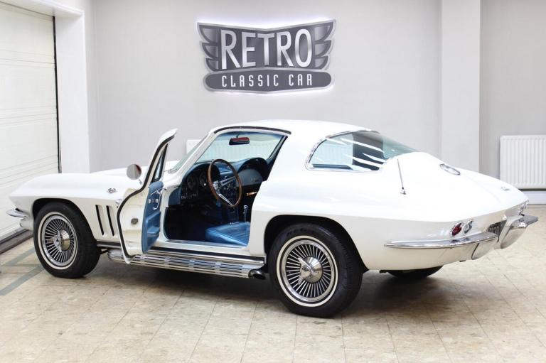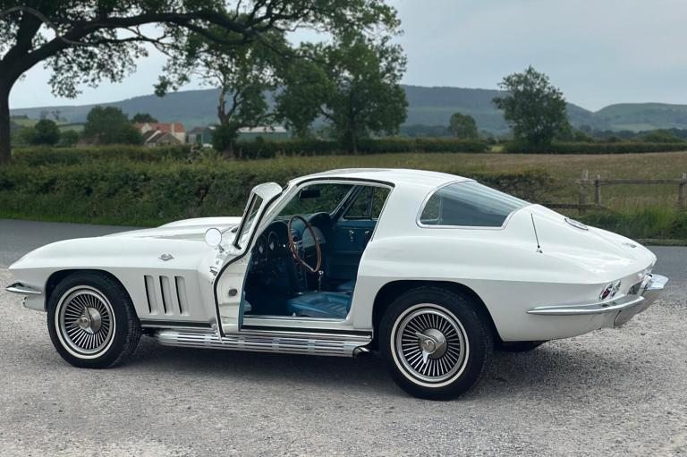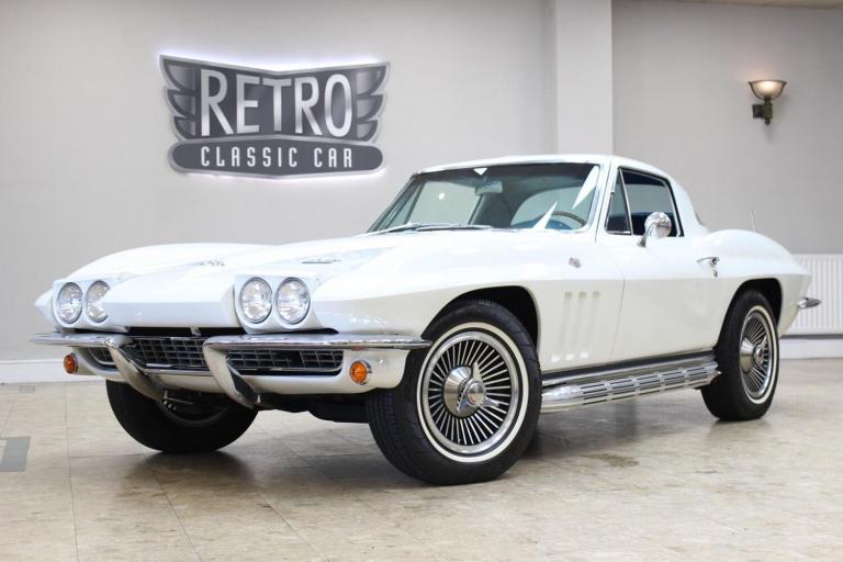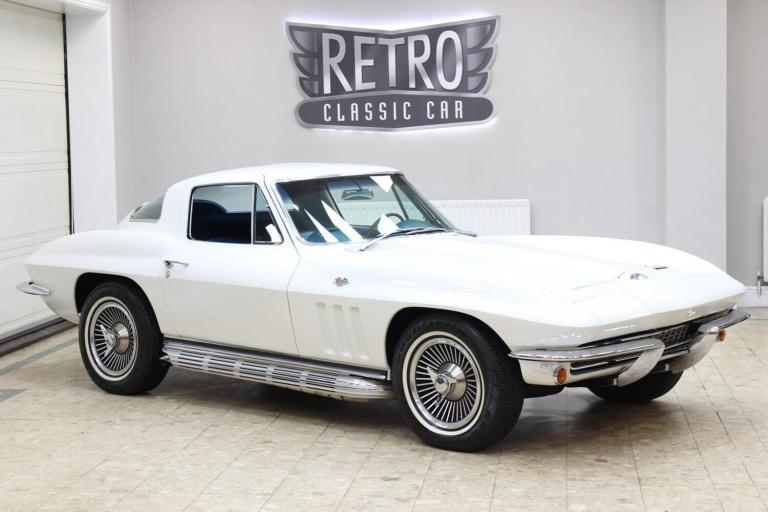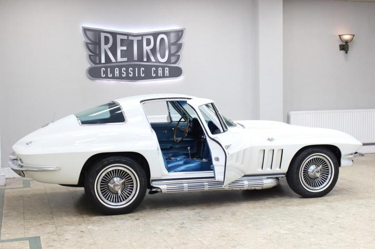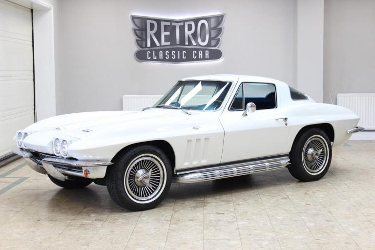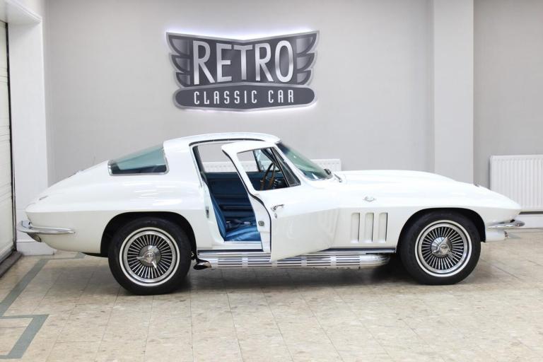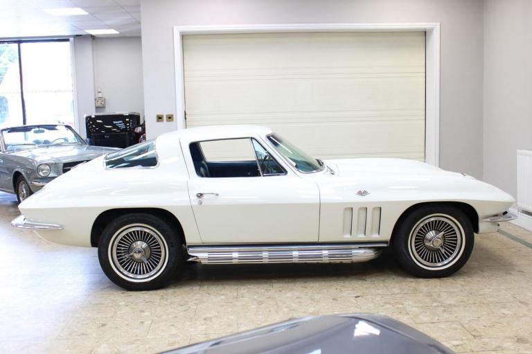 1966 Chevrolet Corvette Stingray C2 327 V8 Manual. Invited and displayed at the world renowned London Concours. Finished in factory Ermine white with Blue interior. Corvette side exhausts and Knock-off wheels fitted with period white-band tyres, the high specification also includes electric windows, power steering, telescopic steering wheel and disc brakes.