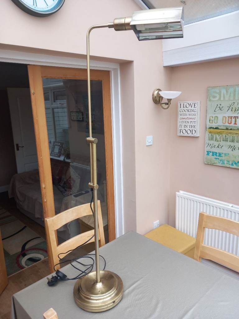 Adjustable brass floor lamp, often referred to as a banker's or task lamp