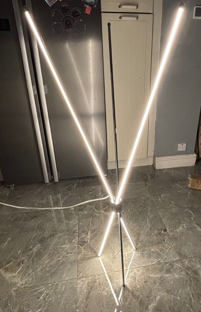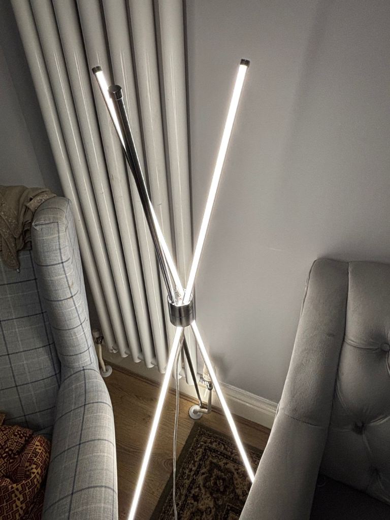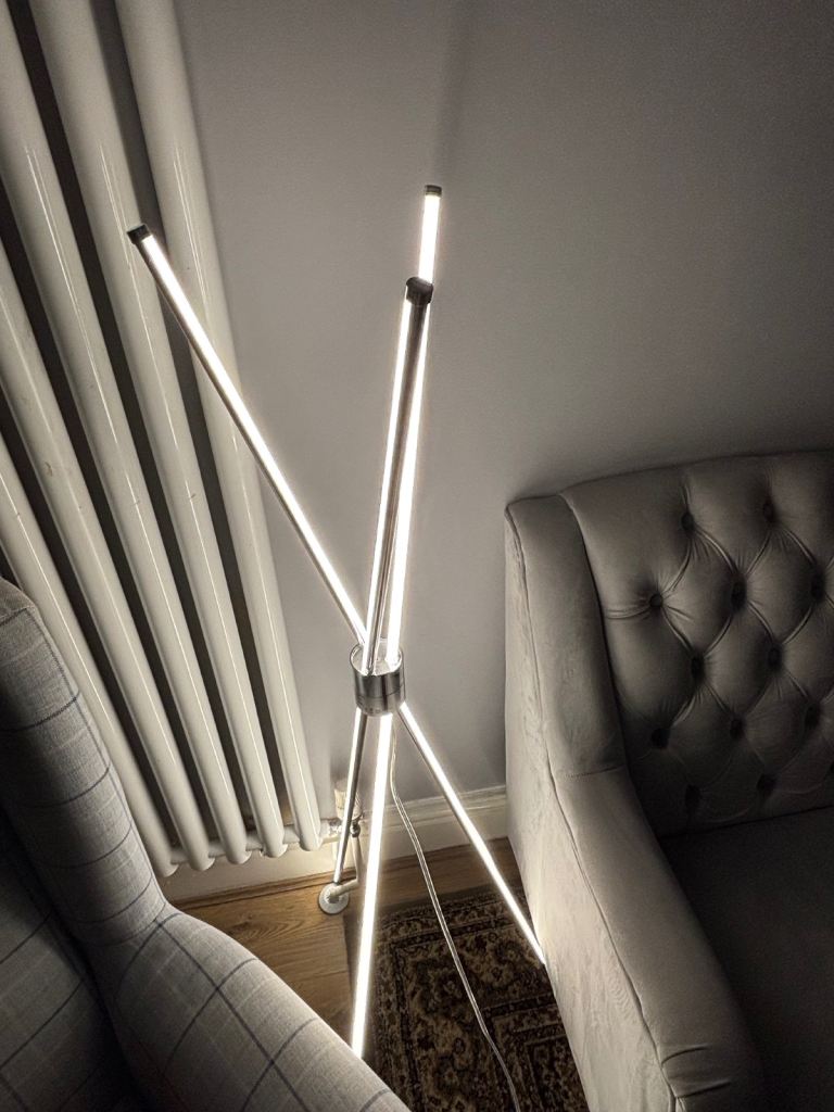 Beautiful modern style LED floor lamp in a tripod style can be adjusted to length and height as required using the round switch.