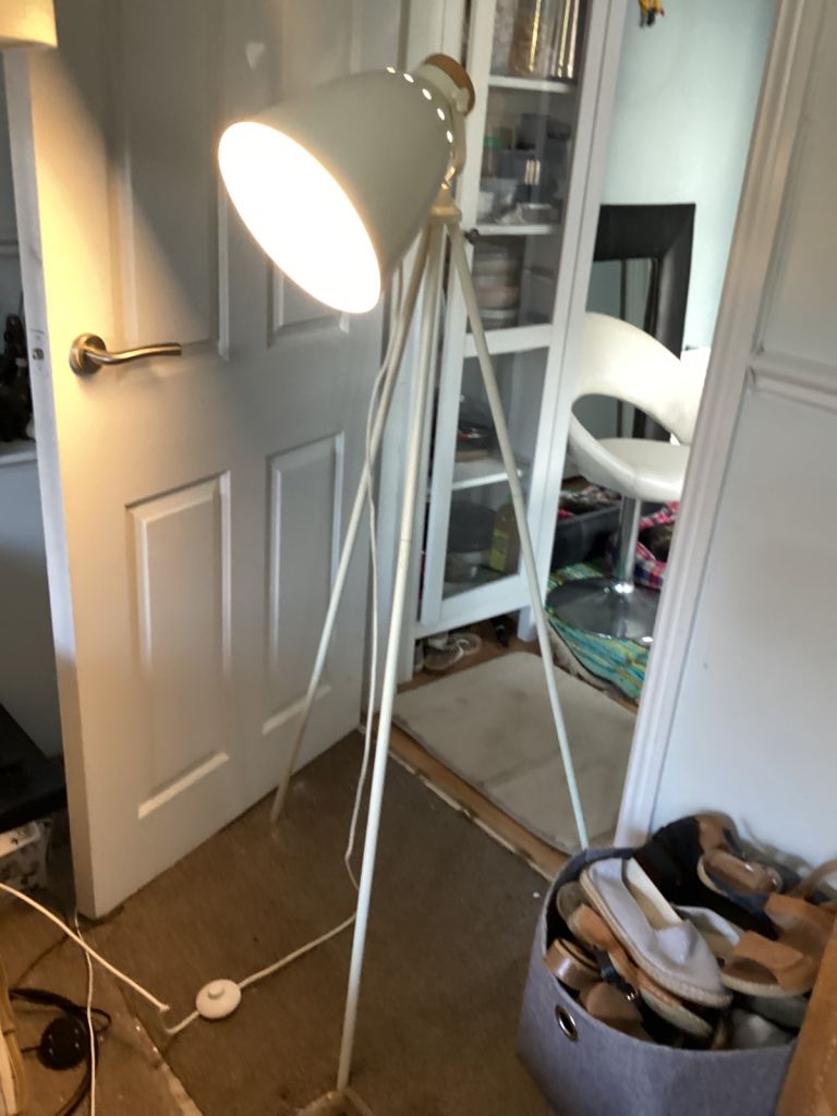 On tripod 4.5 ft tall modern soft white colour lamp. Westbourne. Could deliver