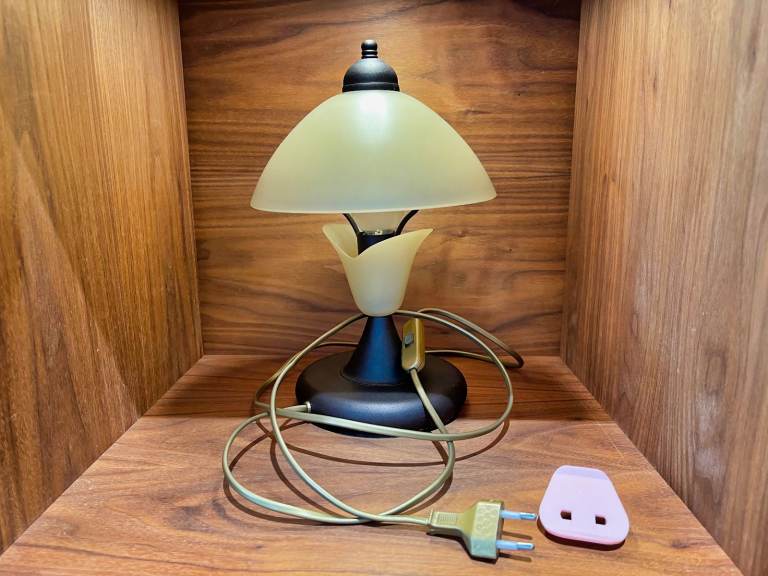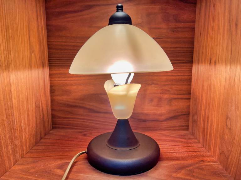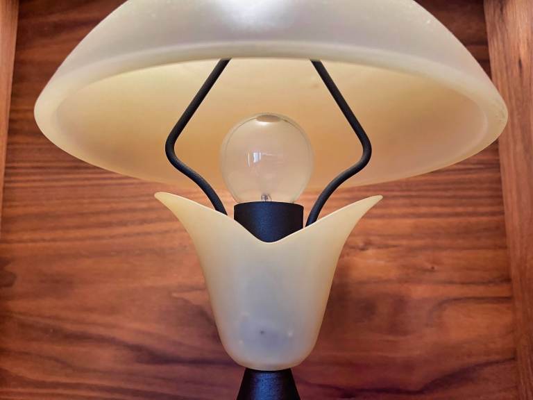 Bring warmth and character to your space with this Murano-style vintage table lamp, featuring an elegant tulip glass diffuser nestled beneath a soft amber domed shade.