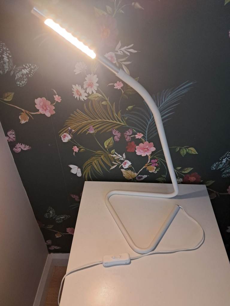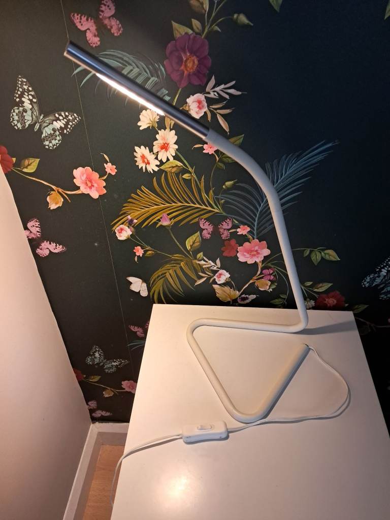 A slimline sleek Desk Lamp with Adjustable head and twist light. Switch control cable with USB to Plug power connection.