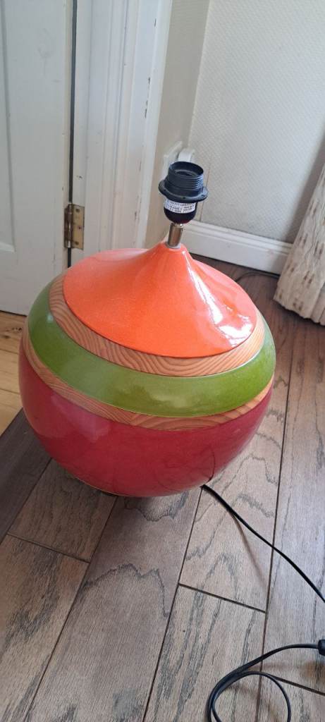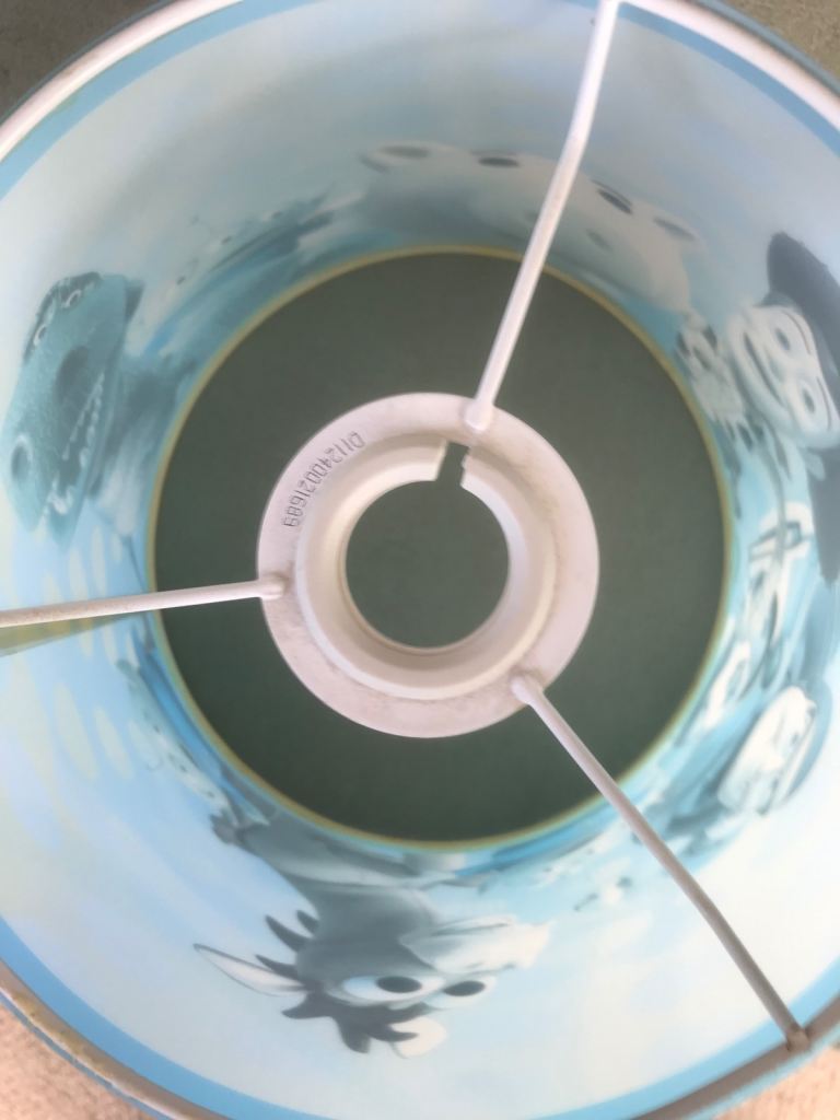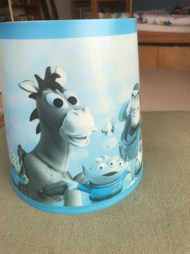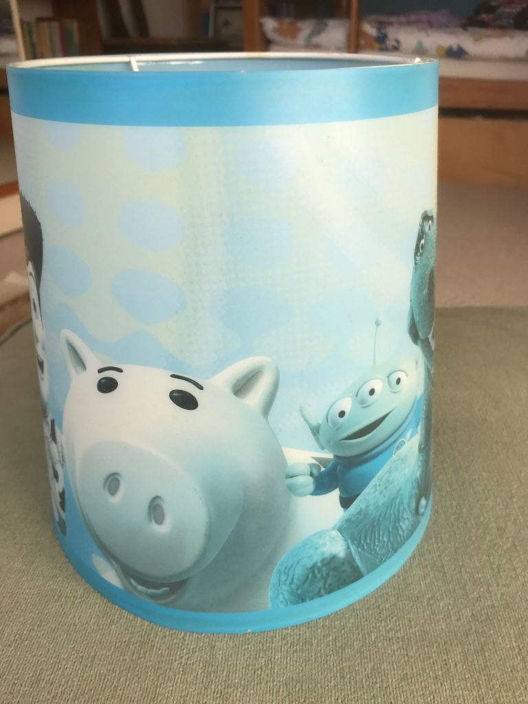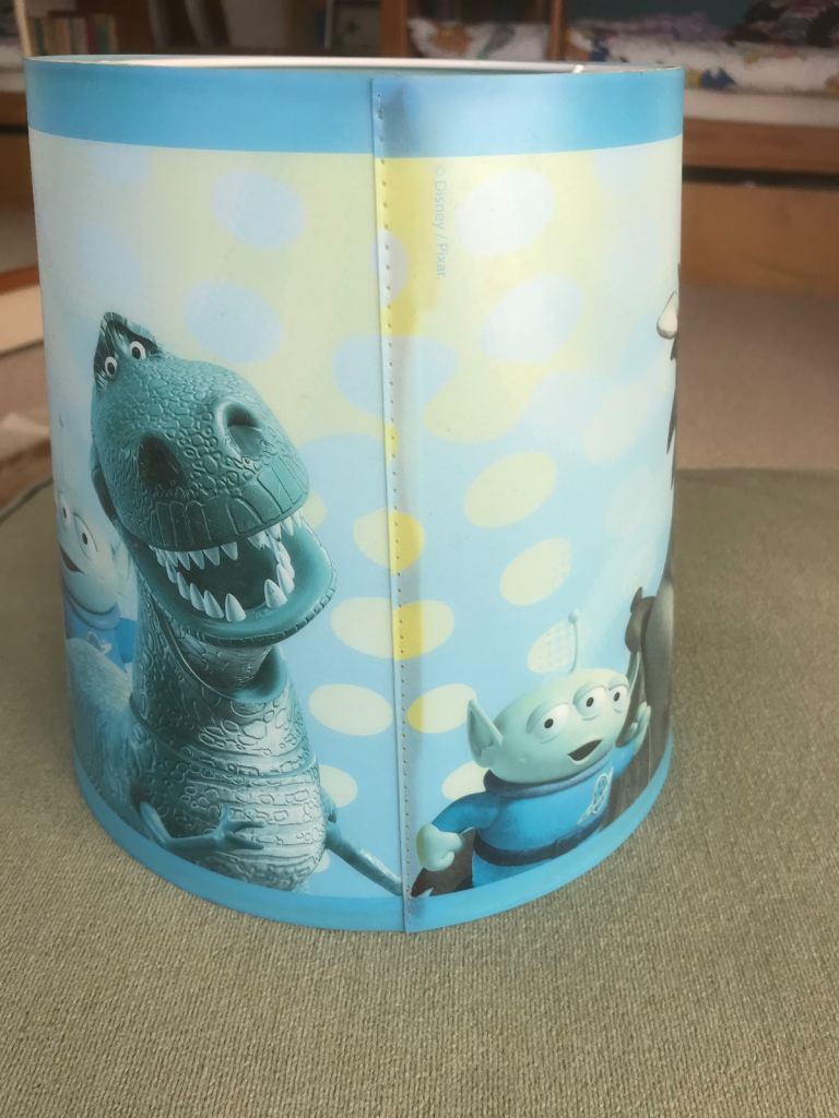Light-shade for pendant light fitting. Can also be used for a table lamp. Pictures are lit from the inside, showing Toy Story characters. Hole for lamp-holder is 2.5cm (1 inch). Height of shade 22cm (9 inches), width 18cm (7 inches) at top, and 22cm (9 inches) at bottom. Made of curved coloured plastic on a metal frame.