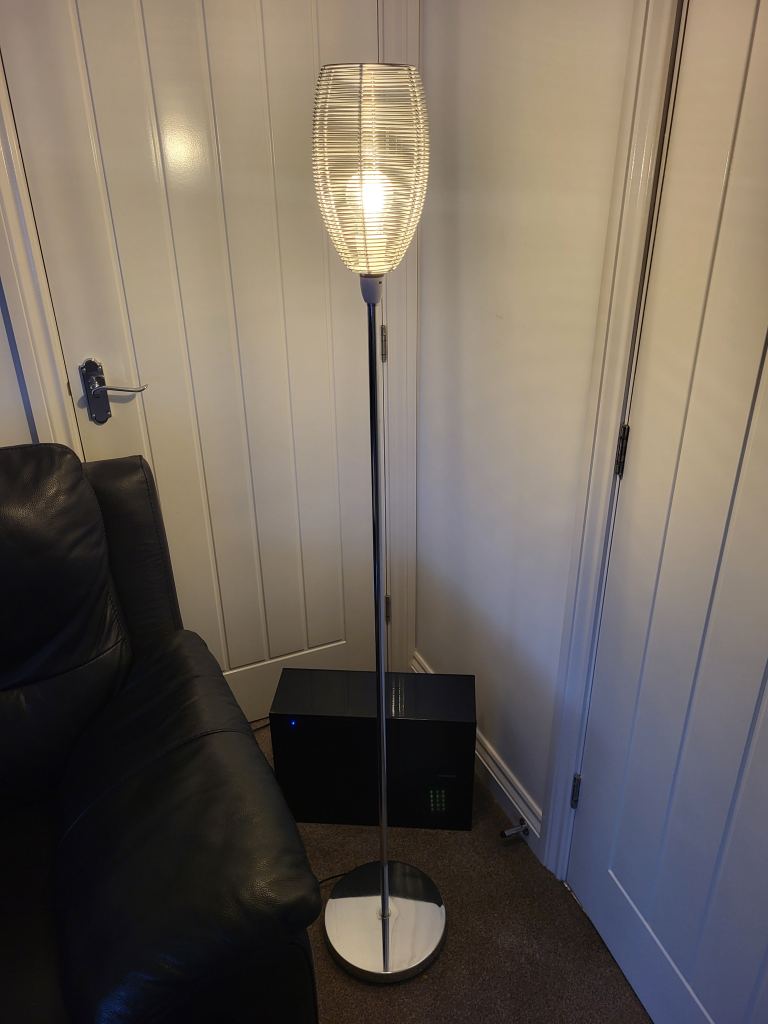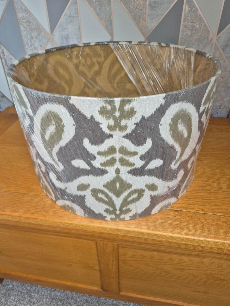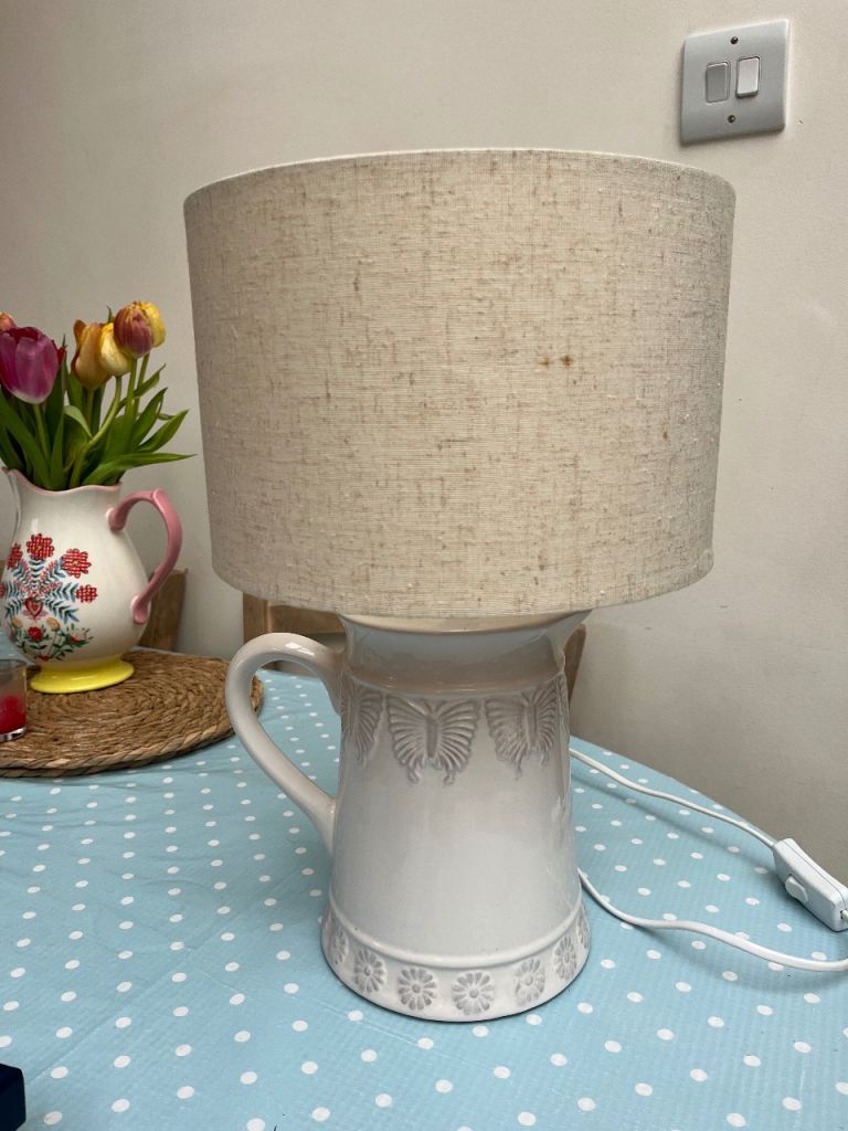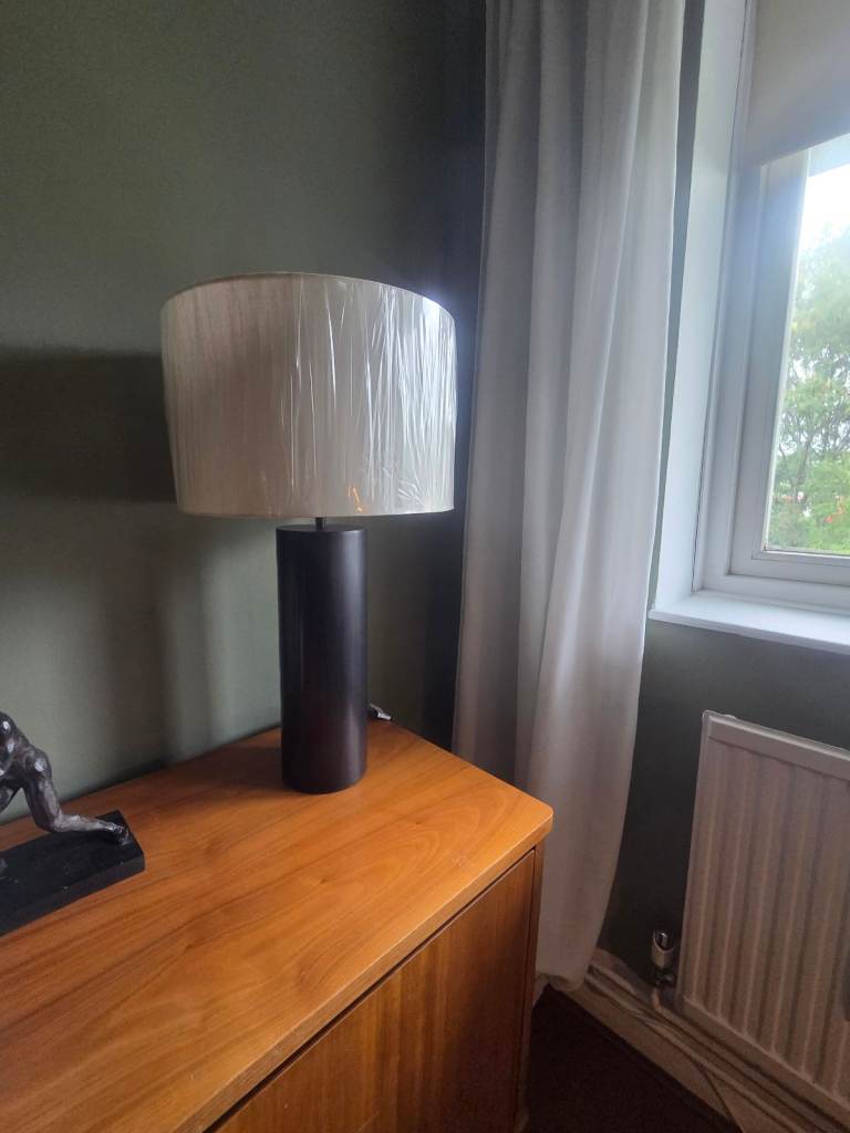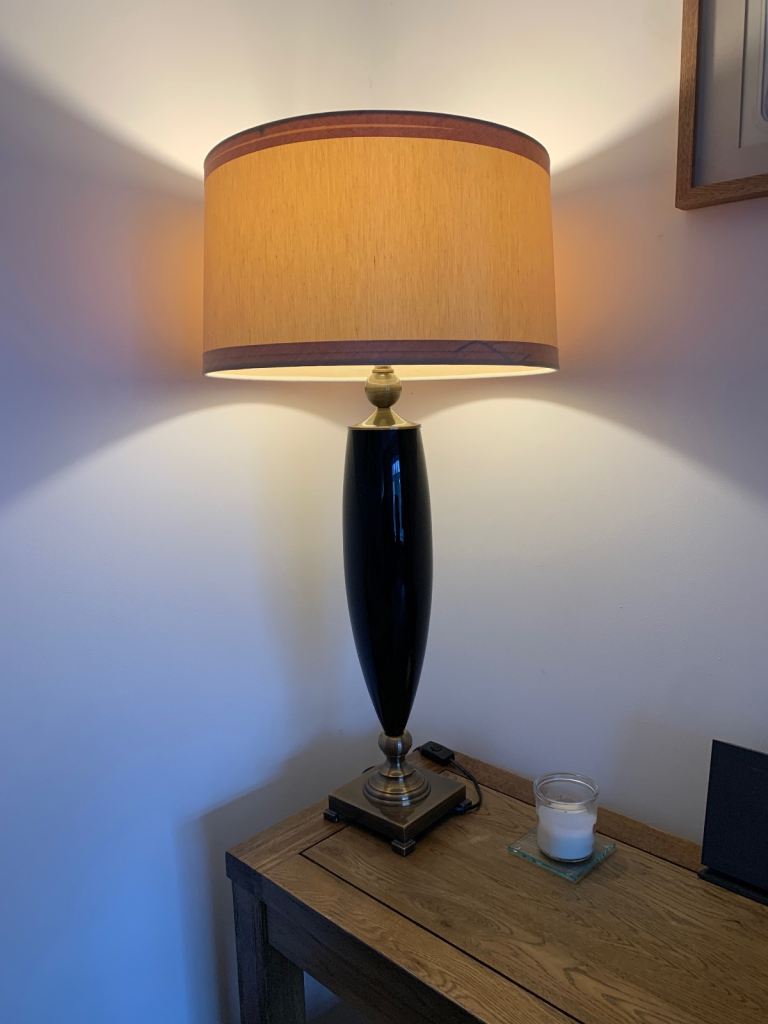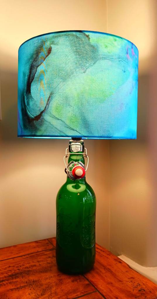 Extra large Grolsch bottle converted to a lamp and topped off with one of my handmade 30cm diameter lampshades.
