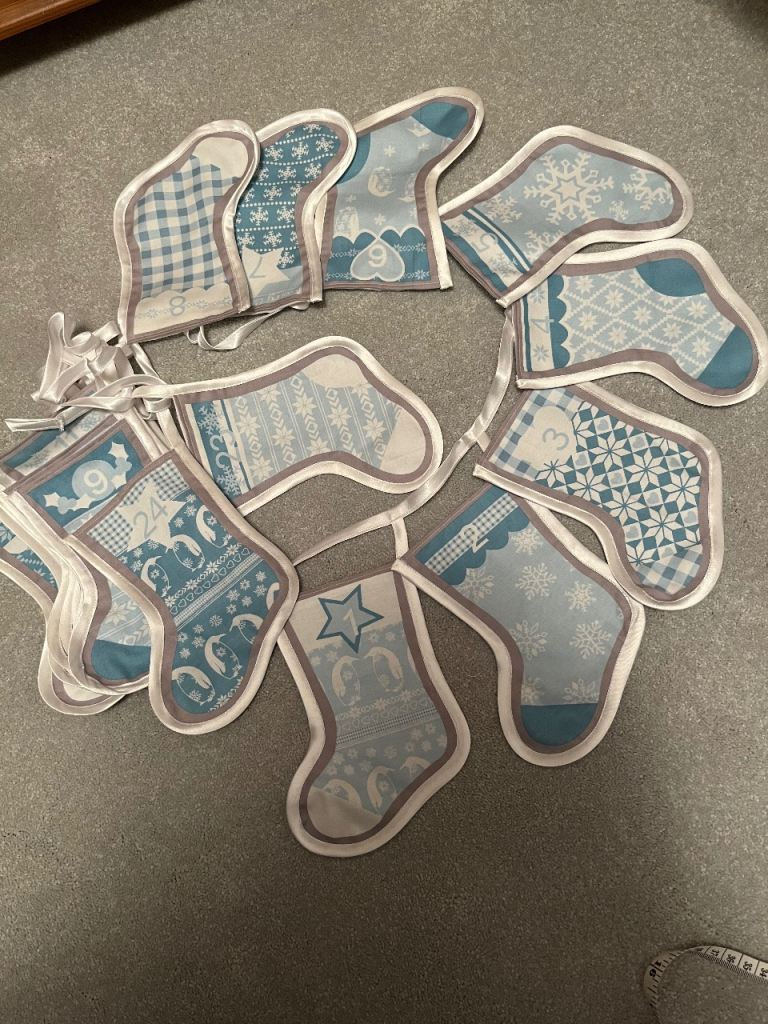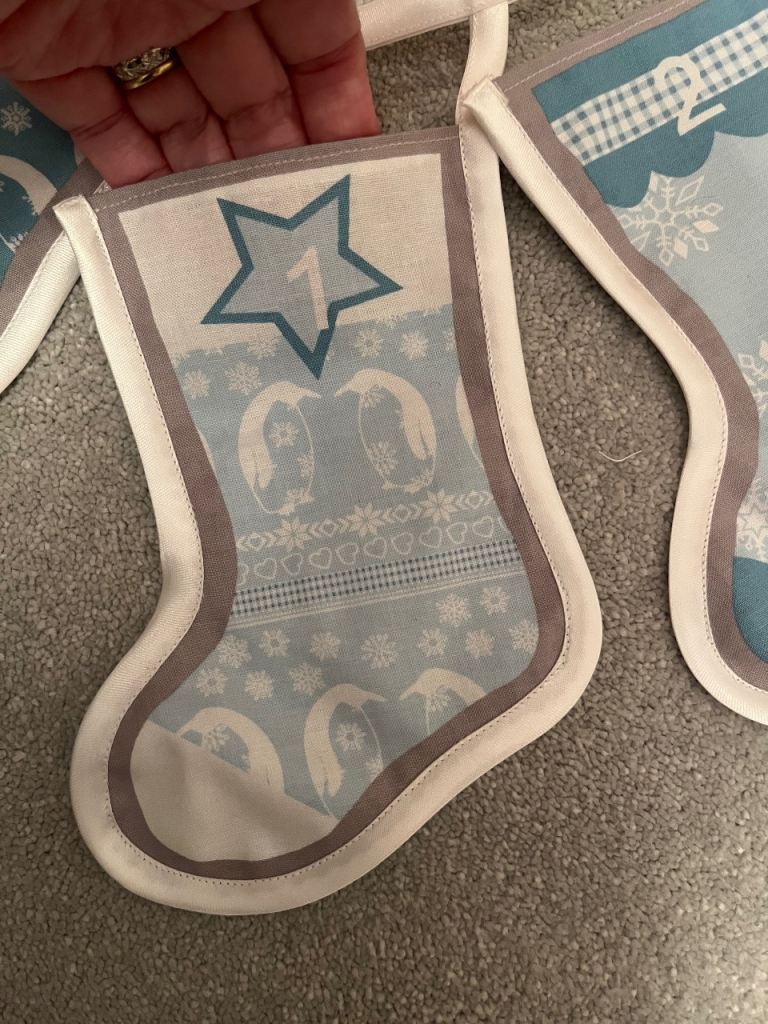 Start your countdown to Christmas with these beautiful mini advent stockings. Each stocking is approximately 7” tall. All stockings are bound and hung from white satin binding. All ready for you to use.