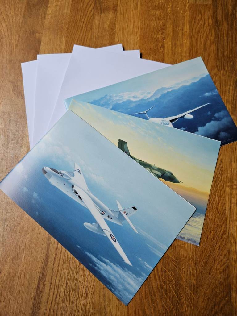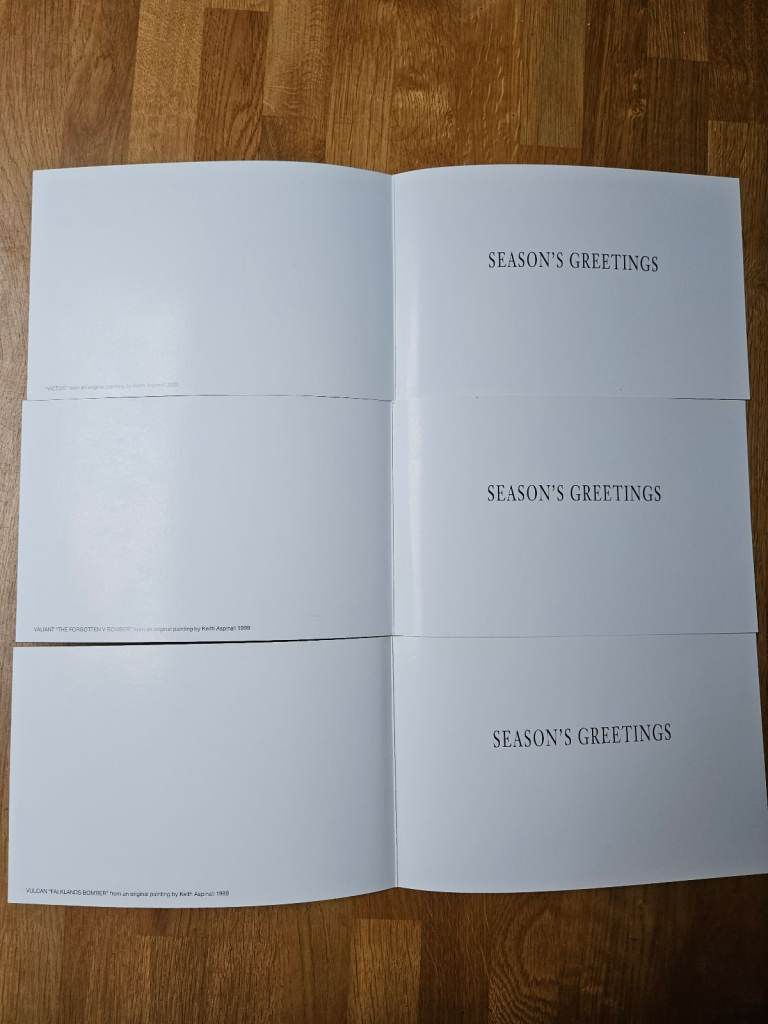 3 Christmas cards & envelopes. Featuring The Valiant, Victor & Vulcan from an original painting by Keith Aspinall. Message inside "Season's Greetings"