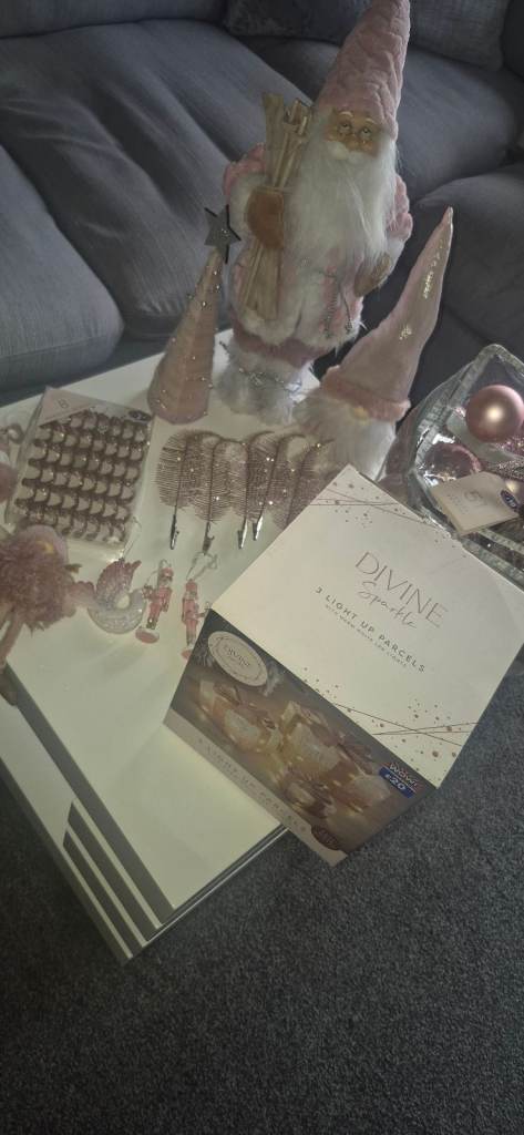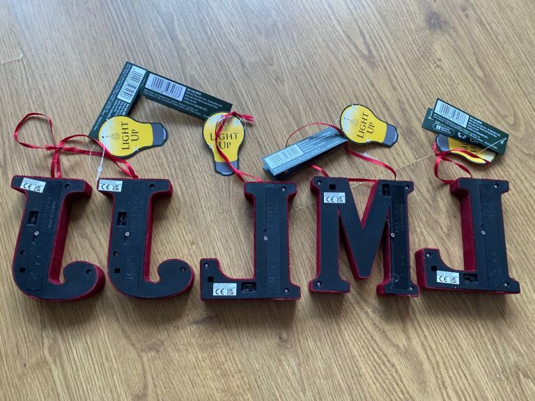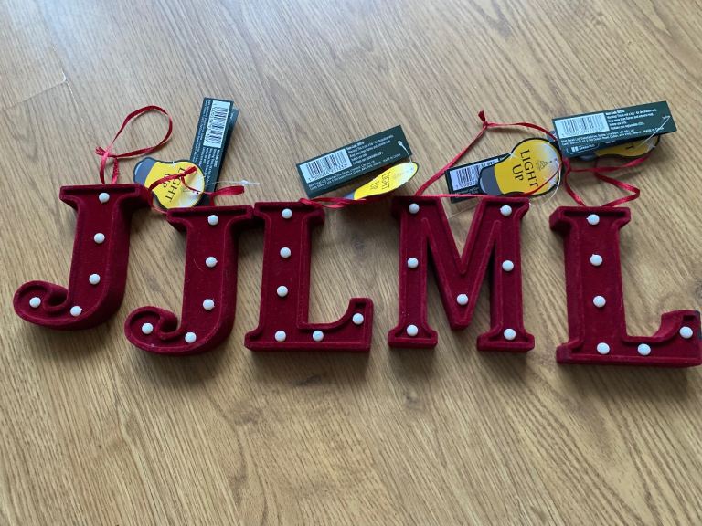 5 hanging tree decorations velvet material on plastic, new with tags however some felt patchy in places where purchased like this and each requires 3 AAA batteries, smoke free home