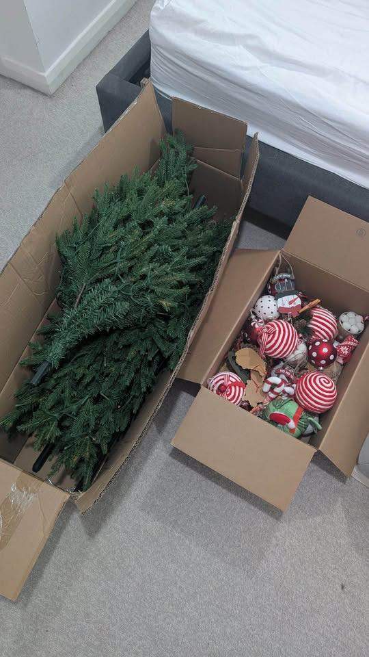 High-quality 6ft artificial Christmas tree, used once and in like-new condition. Features elegant built-in lights, all fully functional, with a full, natural silhouette that creates a warm, cozy and refined atmosphere. Comes with a box of tasteful Christmas decorations, making it an effortless, ready-to-style setup.