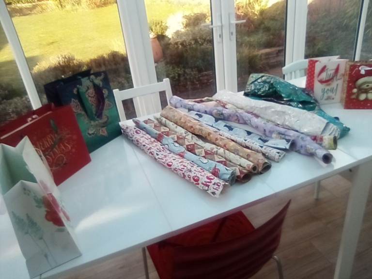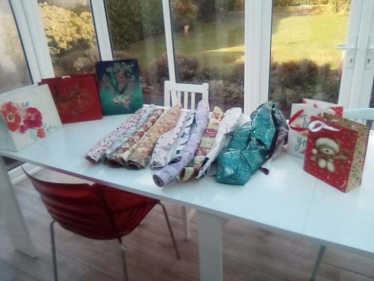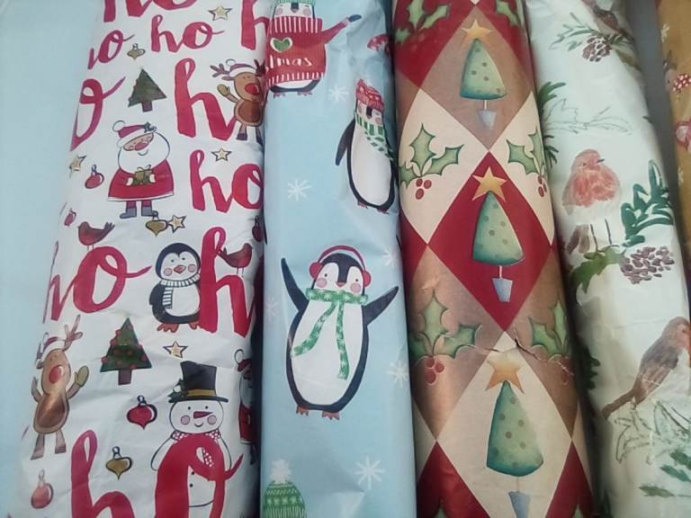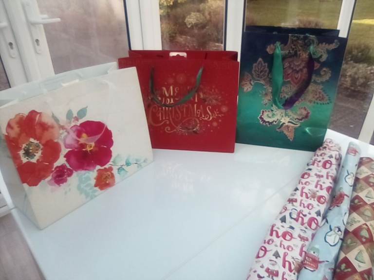 A bumper assortment of unused Christmas and other wrapping paper, and gift bags.
