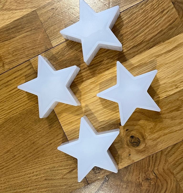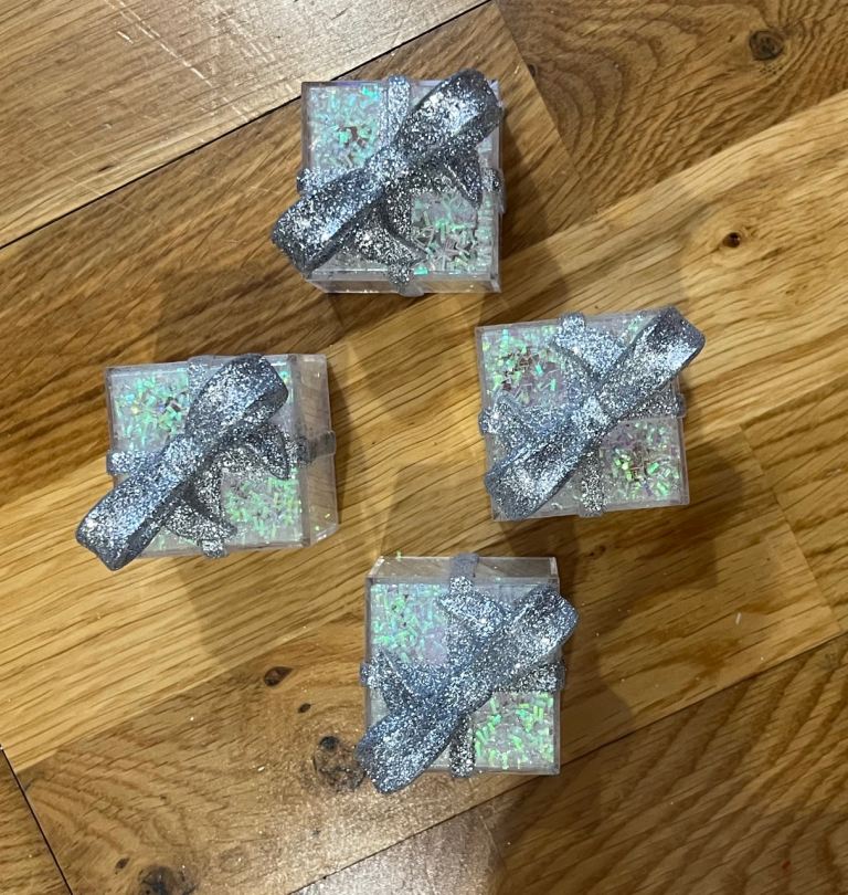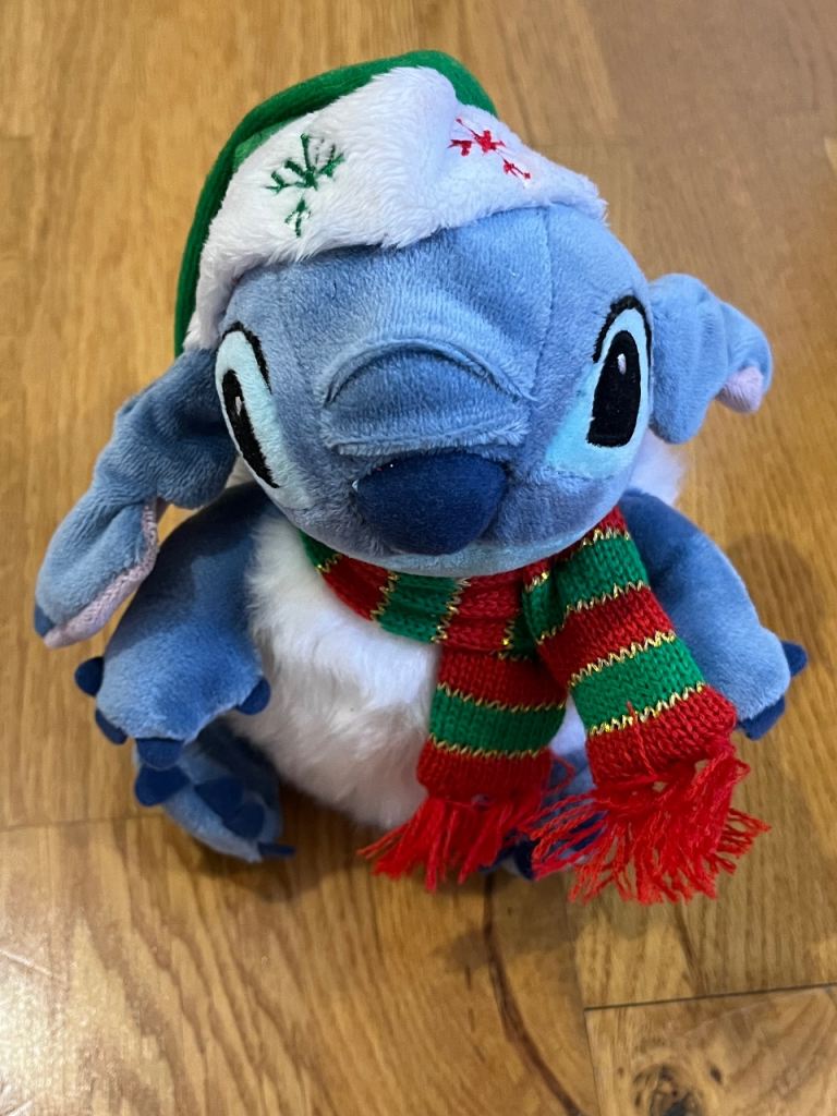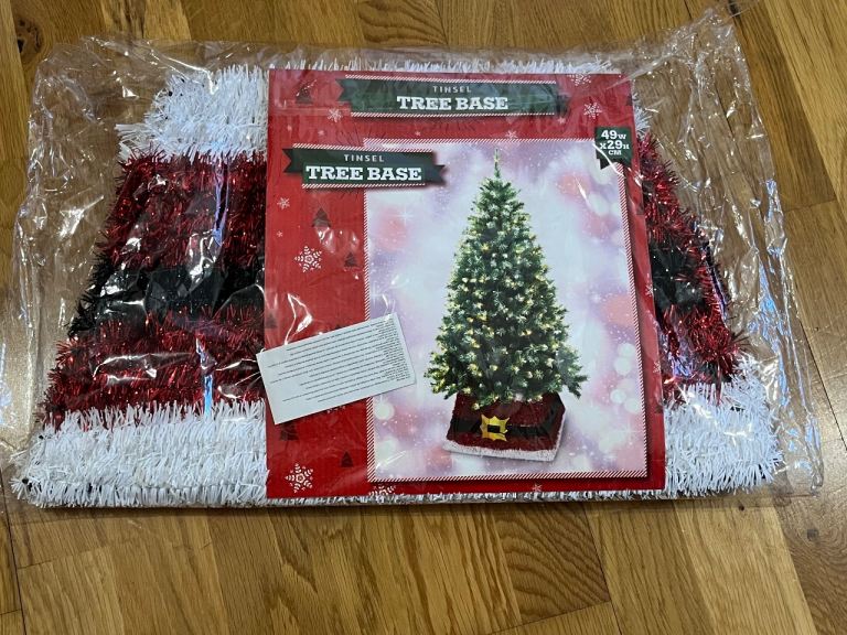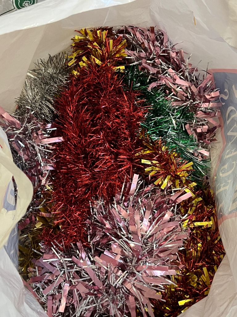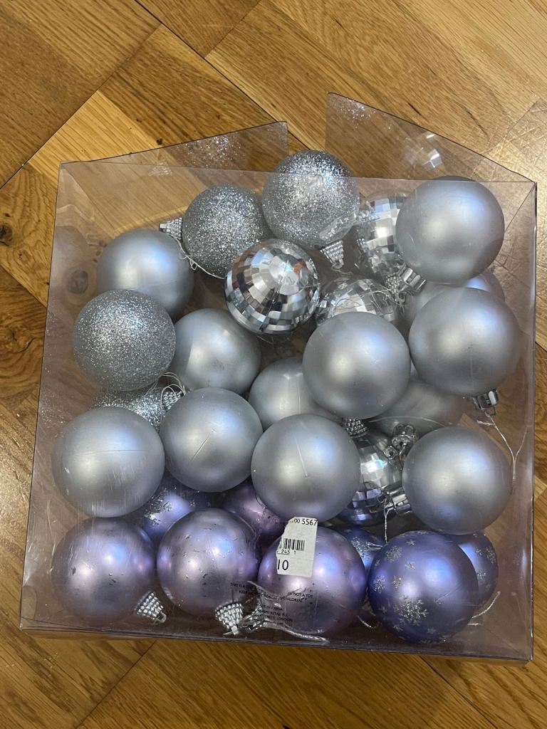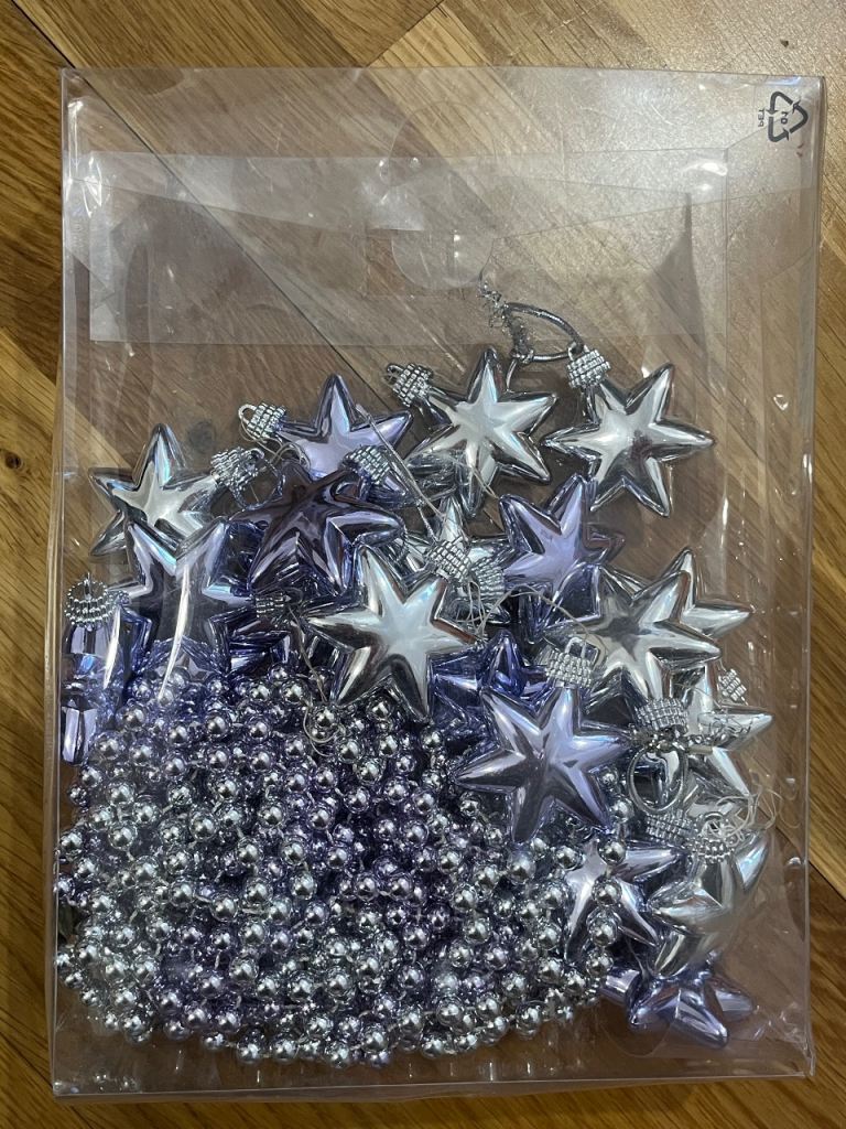 Bundle of assorted Christmas decorations- tinsel Christmas tree skirt; bag of assorted tinsel; gold assorted baubles x 12; silver candle bridge; light up stars x 4 (require batty); Stich soft toy; coloured tree lights x 40 (one bulb needs replacing); box of silver & light purple baubles; box of silver & light purple beads & stars; Christmas tree stand;