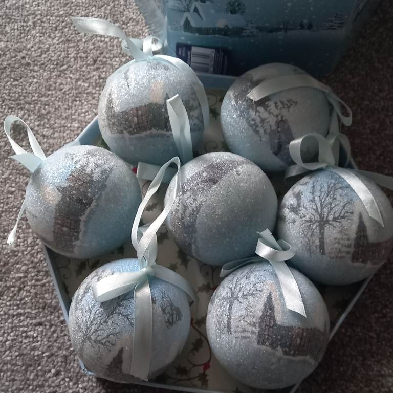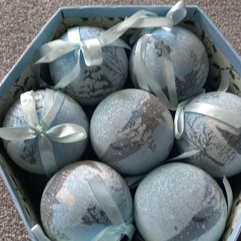 Christmas baubles, very pretty, still in original box as only used one year. Picture on the box is the picture on the baubles