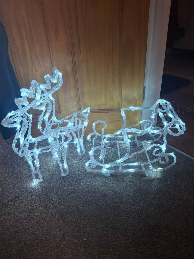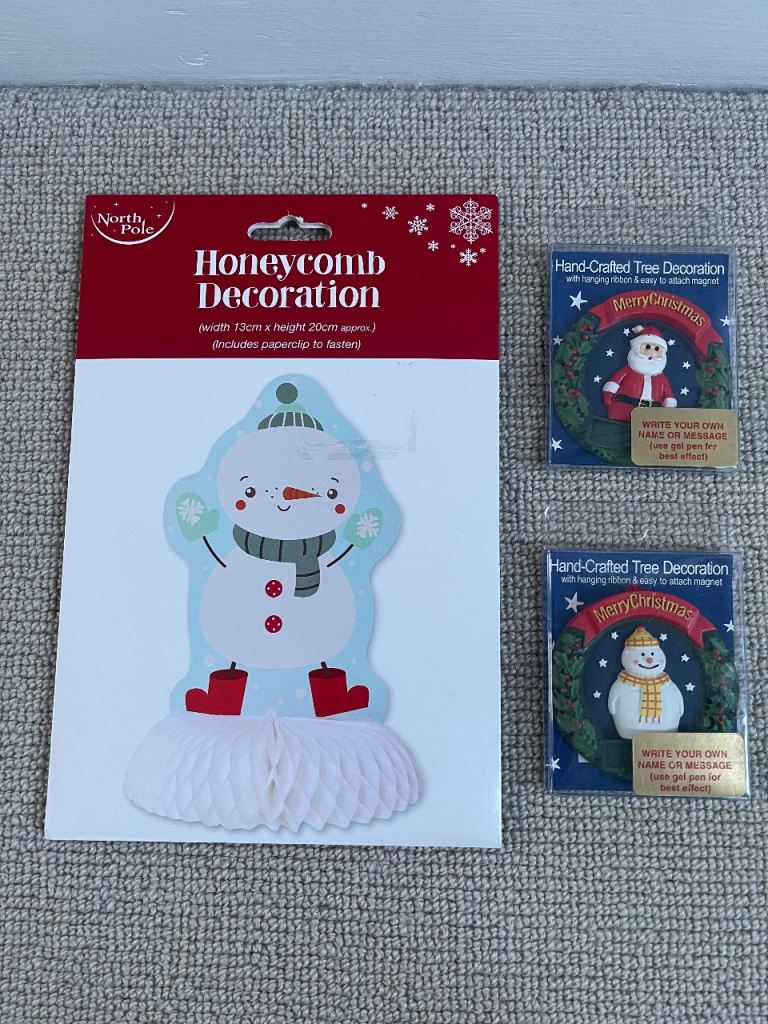 Four white glitter bows, two hanging snowflakes tree decorations, two hanging trees tree decorations, 3-piece LED present string lights, large gift sack, four large Santa gift tags, 25-piece Christmas party set (six plates, six cups, one table cover and twelve napkins)