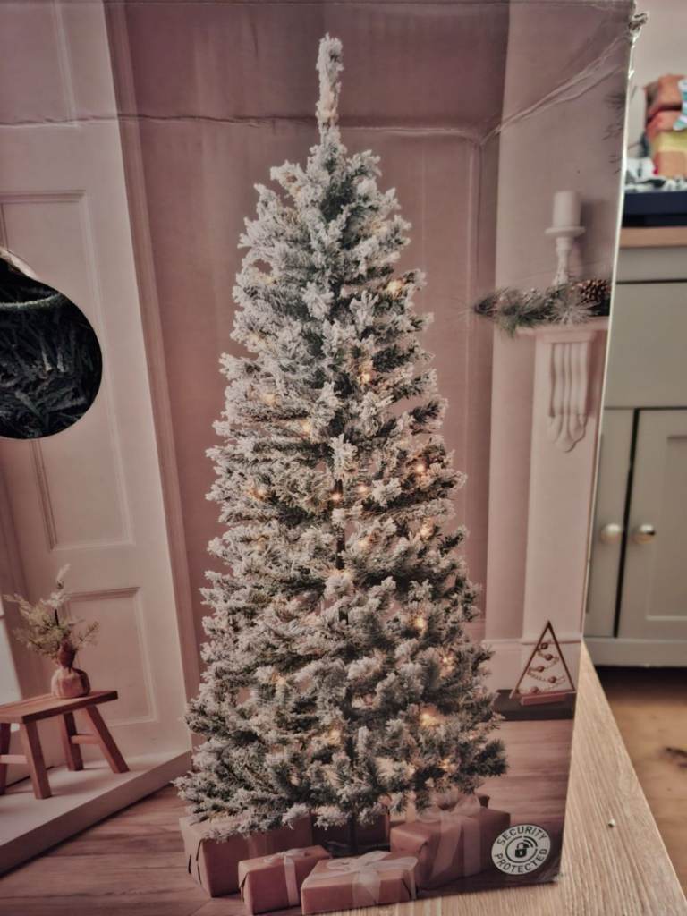 Beautiful snow effect Christmas tree 5ft tall , we've purchased a real potted one to use for a few year's now so this need's to find a new home for the festive season. It comes apart and has the original box to safety put it away again.