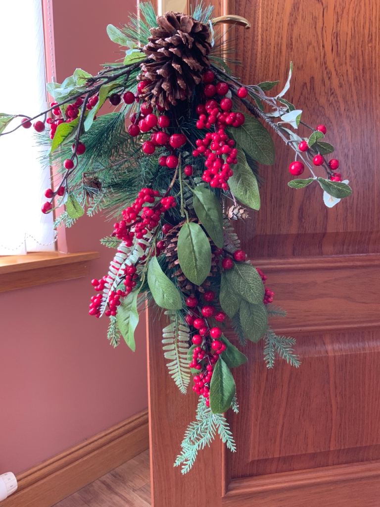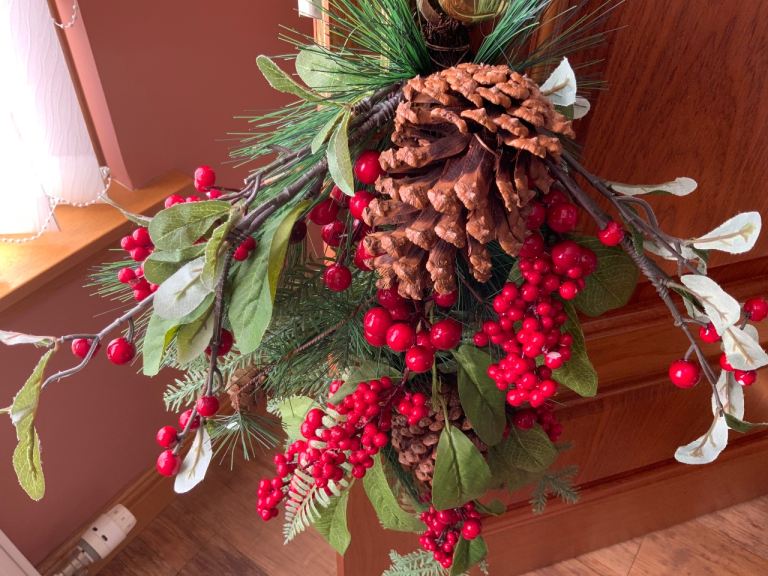 This unusual shaped Christmas wreath would suit any door either outdoor or indoor,