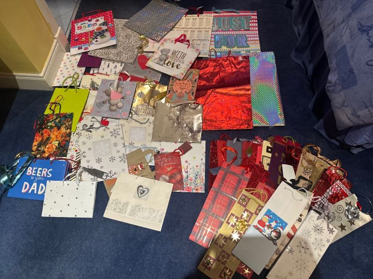 Large collection of gift bags all sizes mostly Xmas style 80 in total incl 20 wine bags