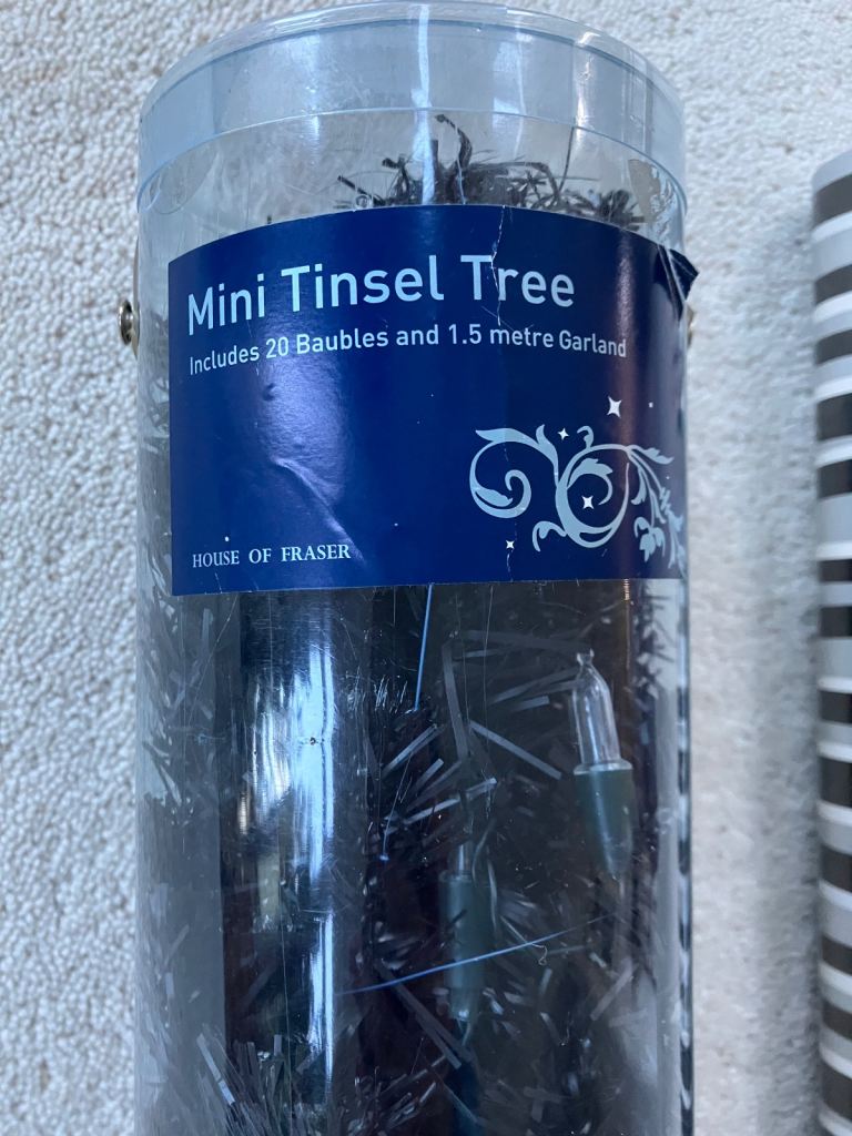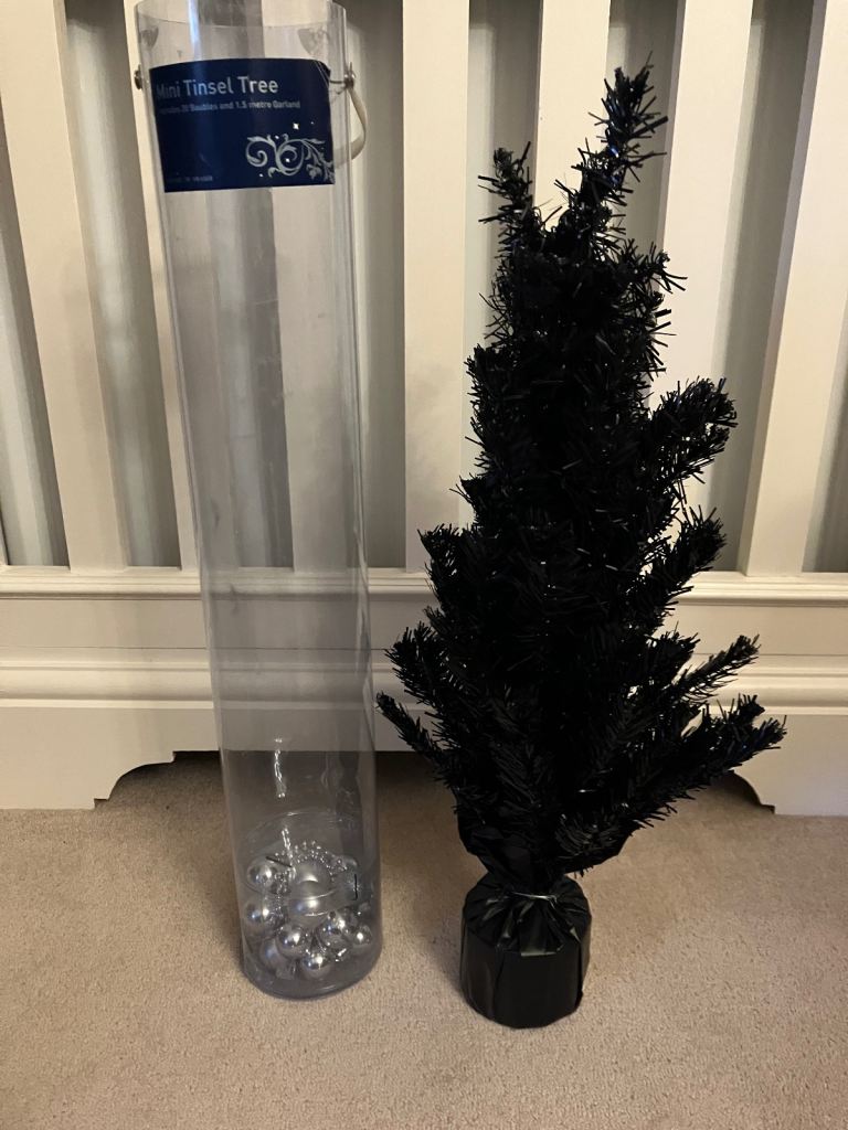 House of Fraser Black Tinsel Mini Christmas Tree with baubles and wrapping paper