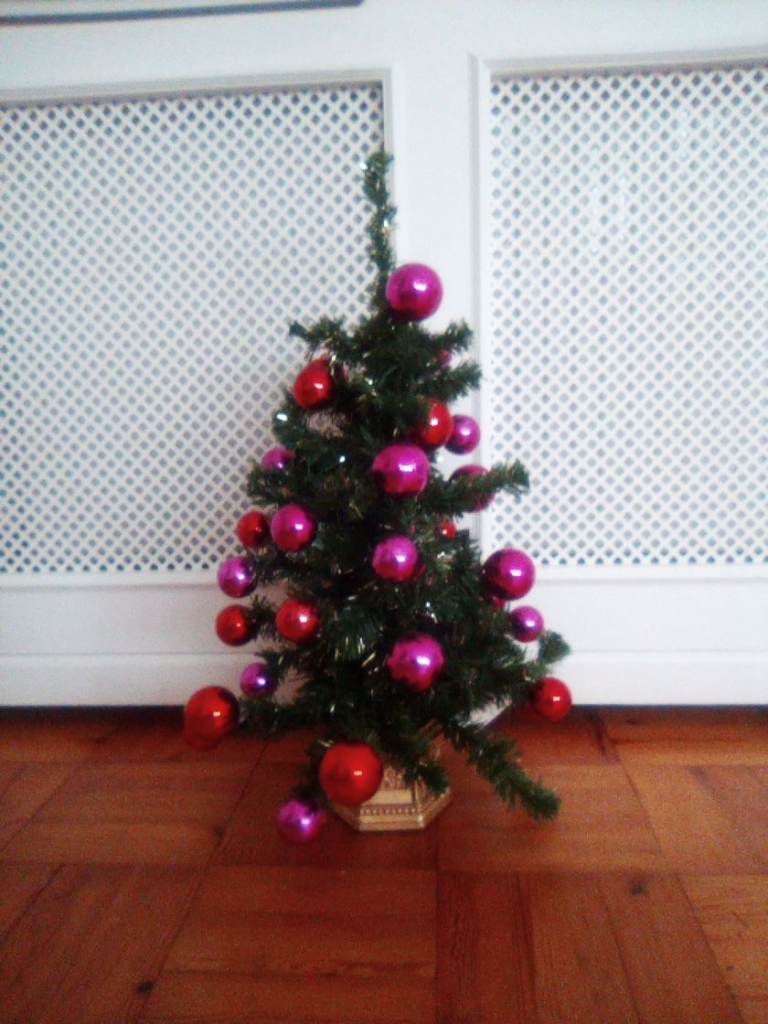 John Lewis small artificial Christmas tree, with bauble and other decorations.