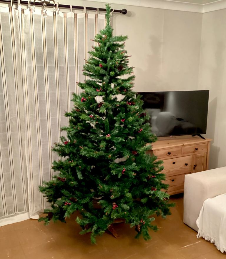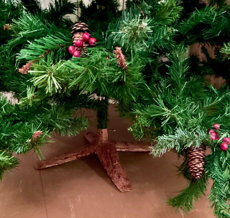 Large artificial Christmas tree with pine cones and berries