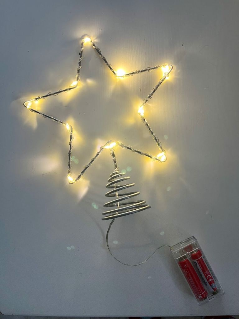 Light up star for the top of the Christmas tree. Approx 23cm tall and 19cm wide. Requires 2x AA batteries (not included).