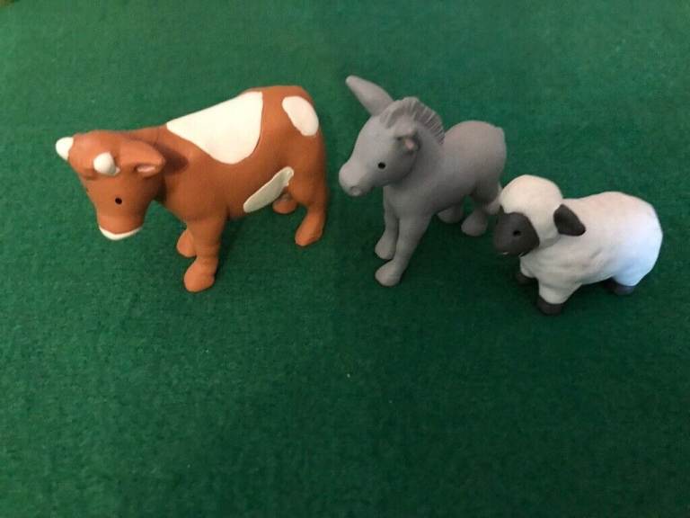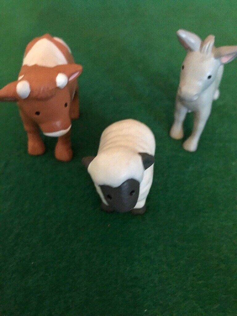 Size:- approx. Joseph 6cm x 3cm -Mary 6cm x 3cm Jesus in straw bed 4cm x 4cm - Three Kings 7cm x 3cm - cow 7cm x 5cm - Donkey 6cm x 6cm - Sheep 5cm x 4cm