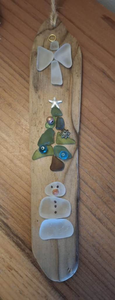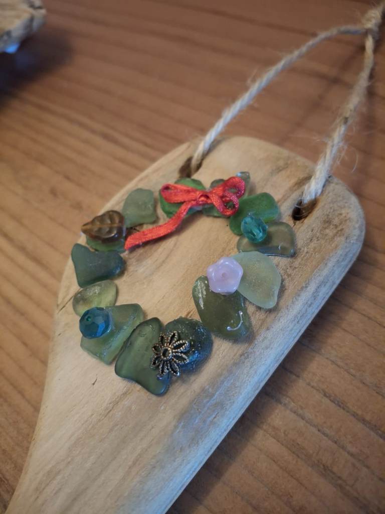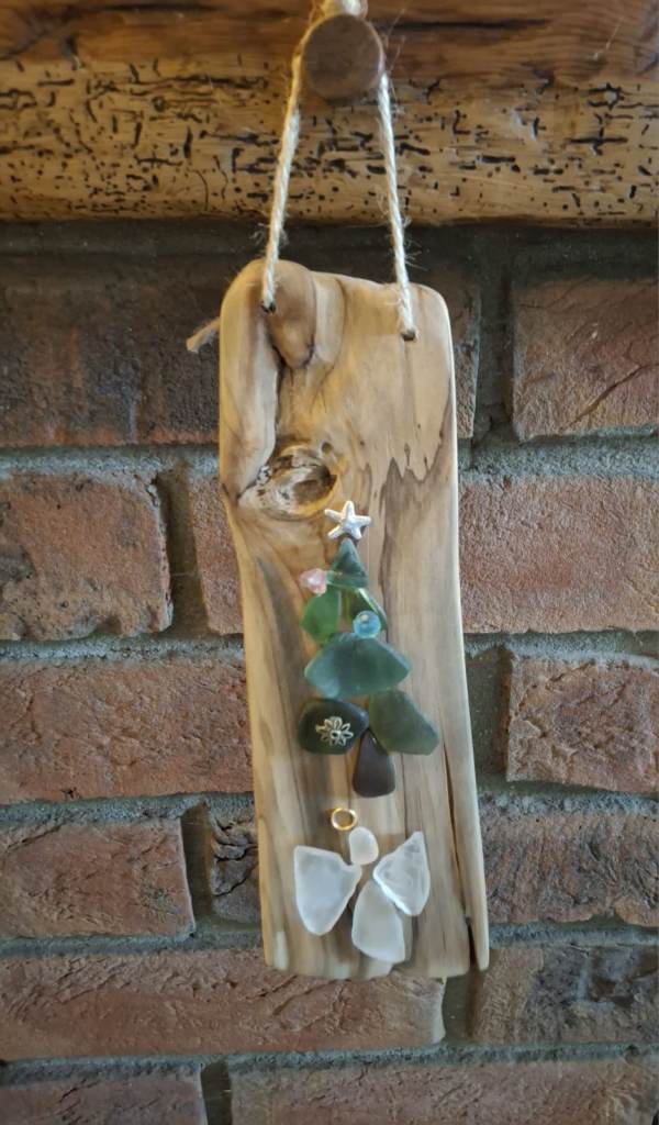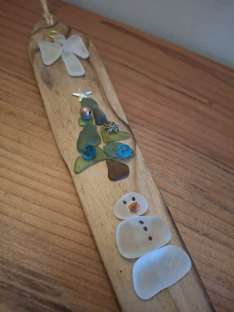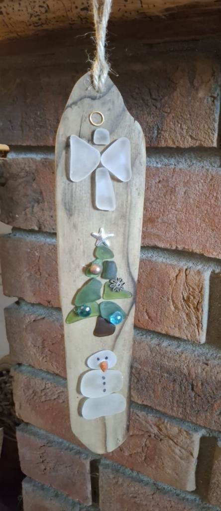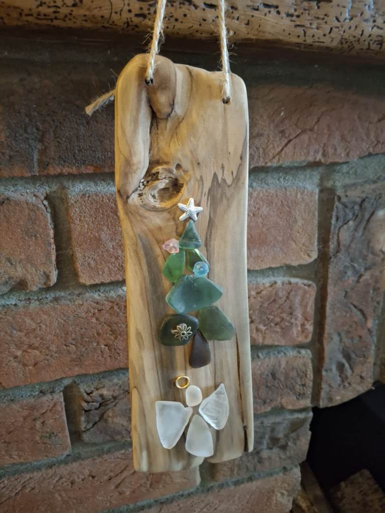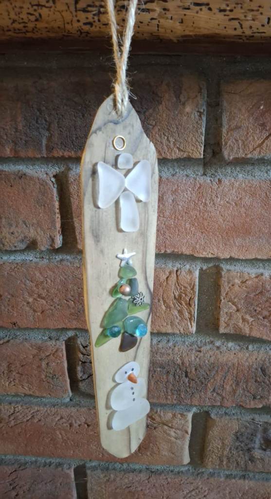 A handmade set of Christmas decorations made by Helen as seen in the photos. These are made from driftwood and sea glass all collected from the Gower coast. This is a set of 4