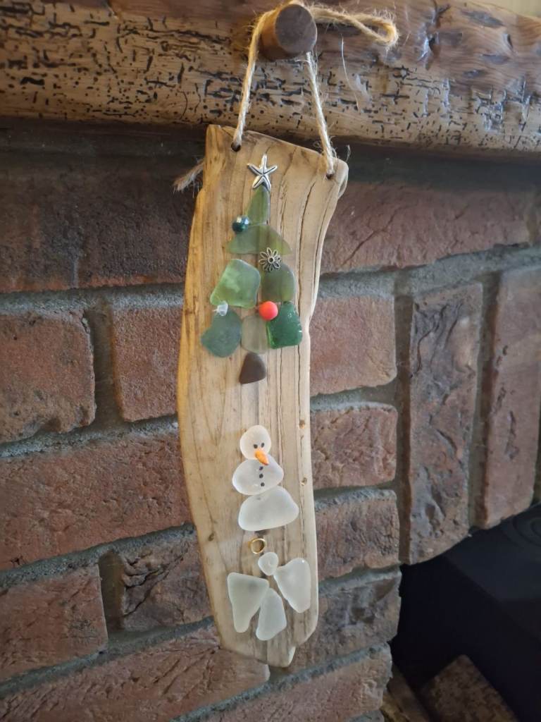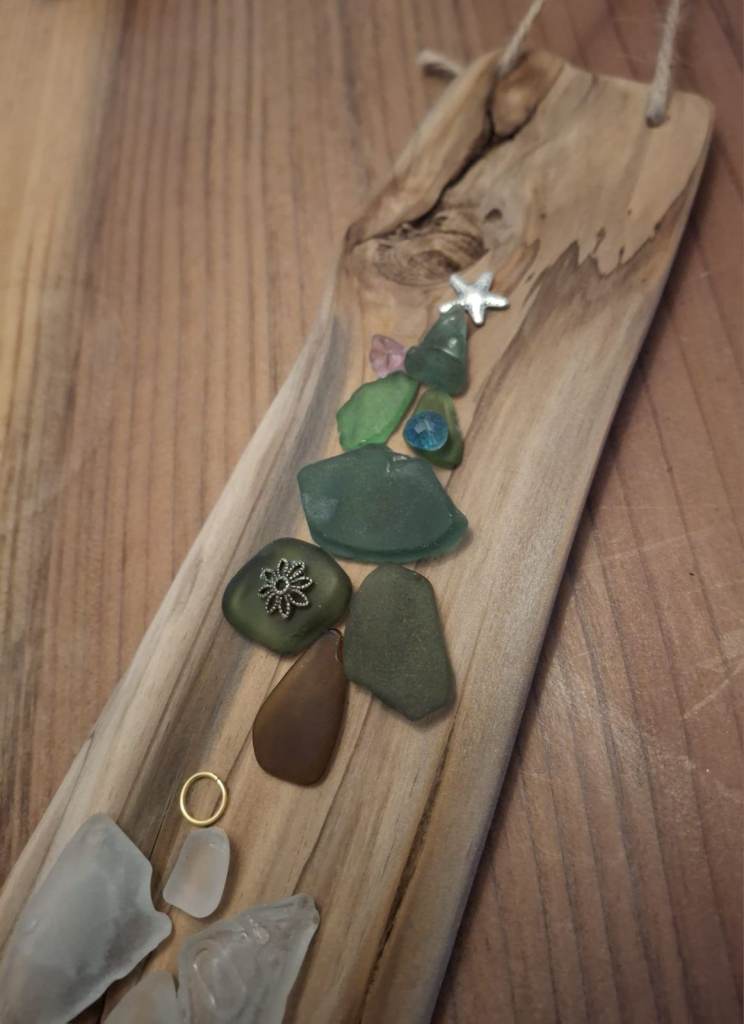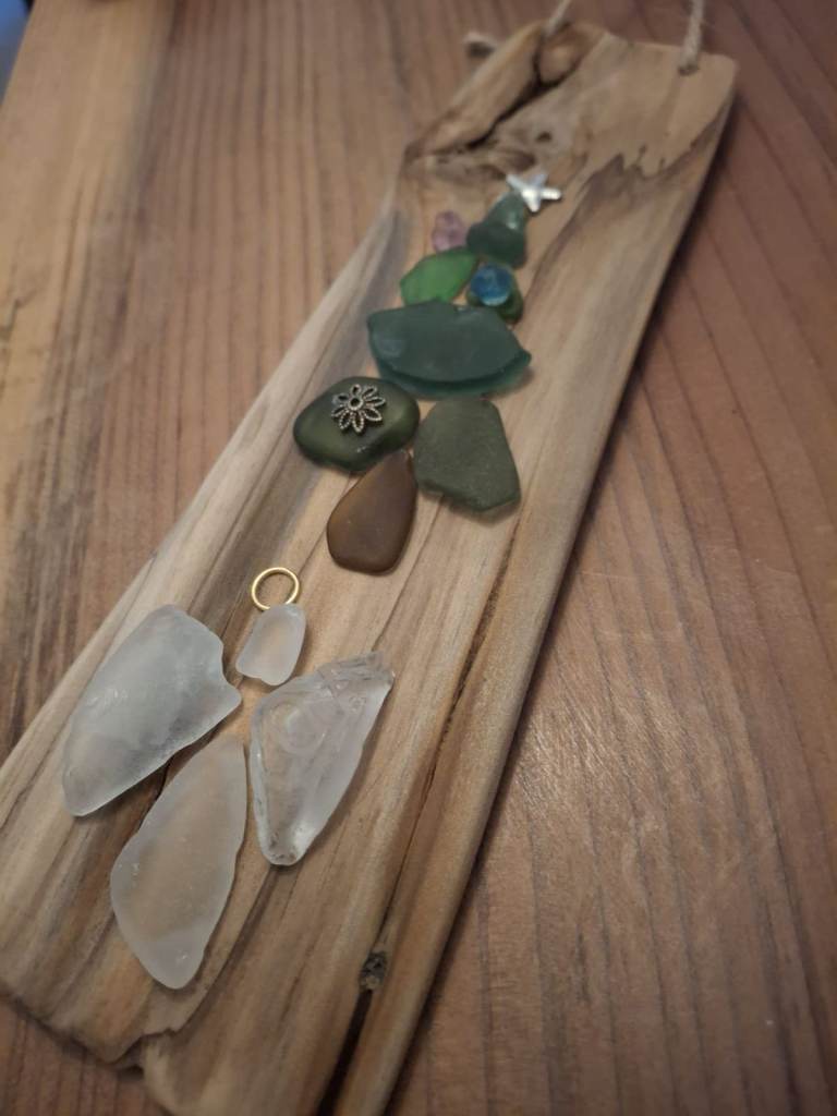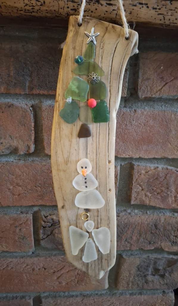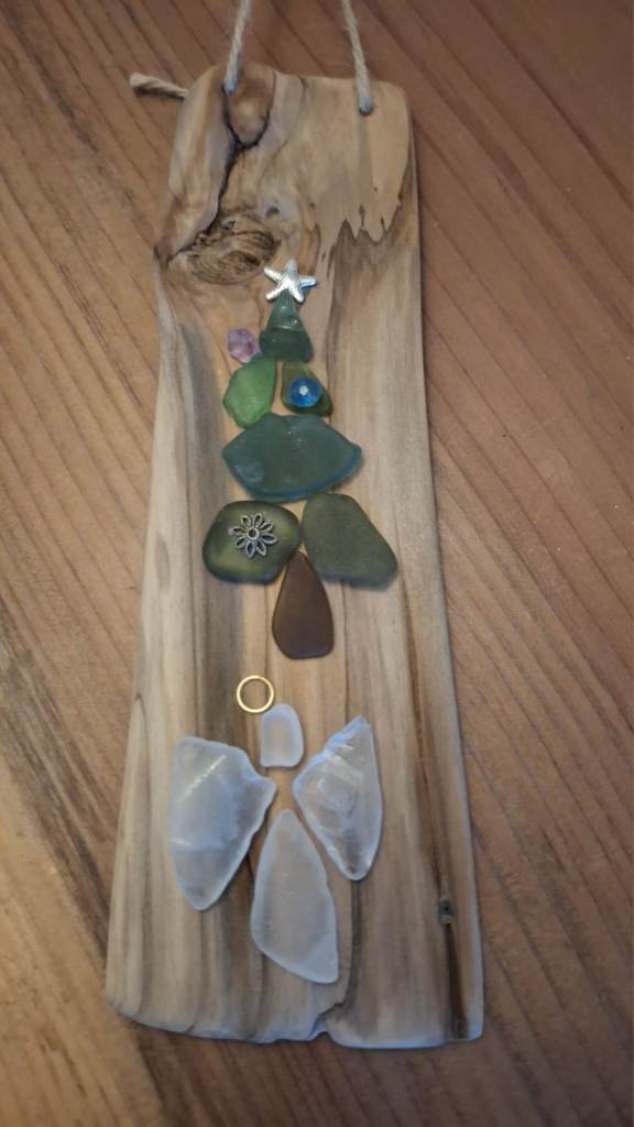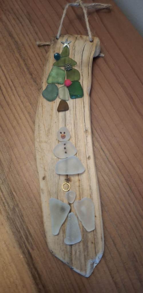 A handmade set of Christmas decorations made by Helen as seen in the photos. These are made from driftwood and sea glass all collected from the Gower coast. This is a set of 4
