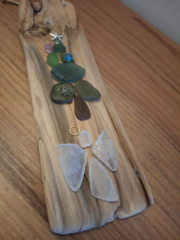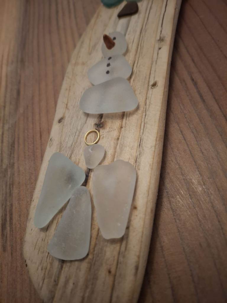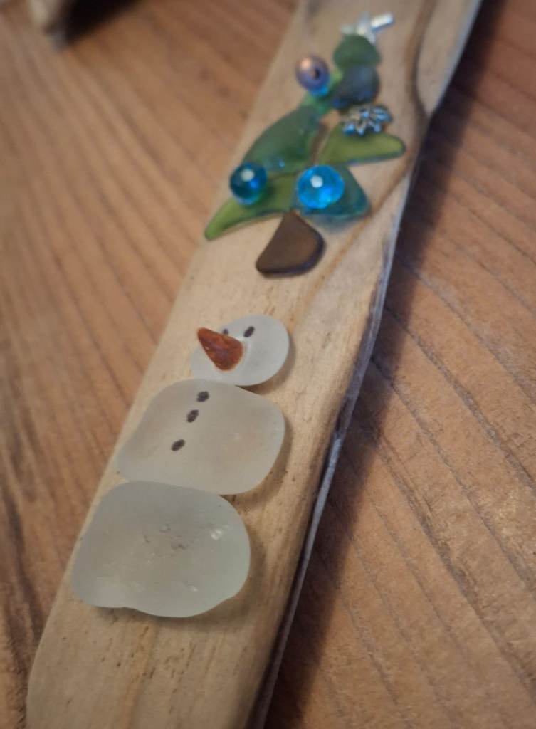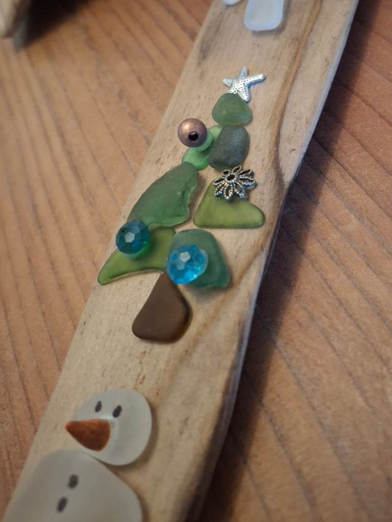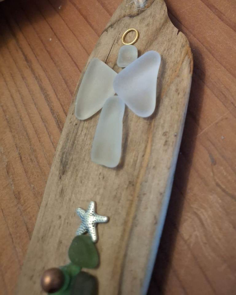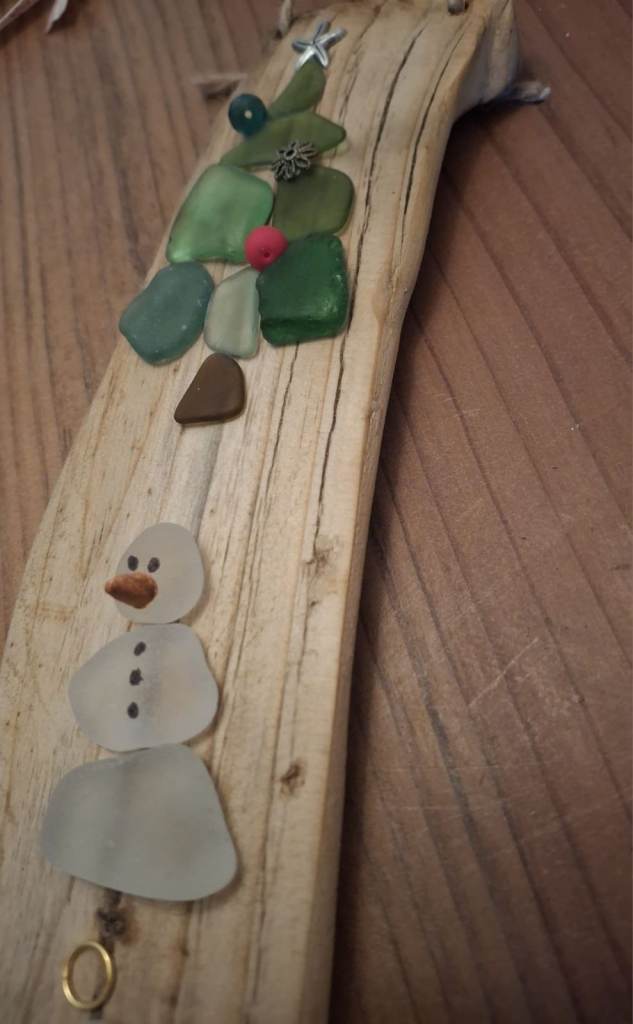 A handmade set of Christmas decorations made by Helen as seen in the photos. These are made from driftwood and sea glass all collected from the Gower coast. This is a set of 4