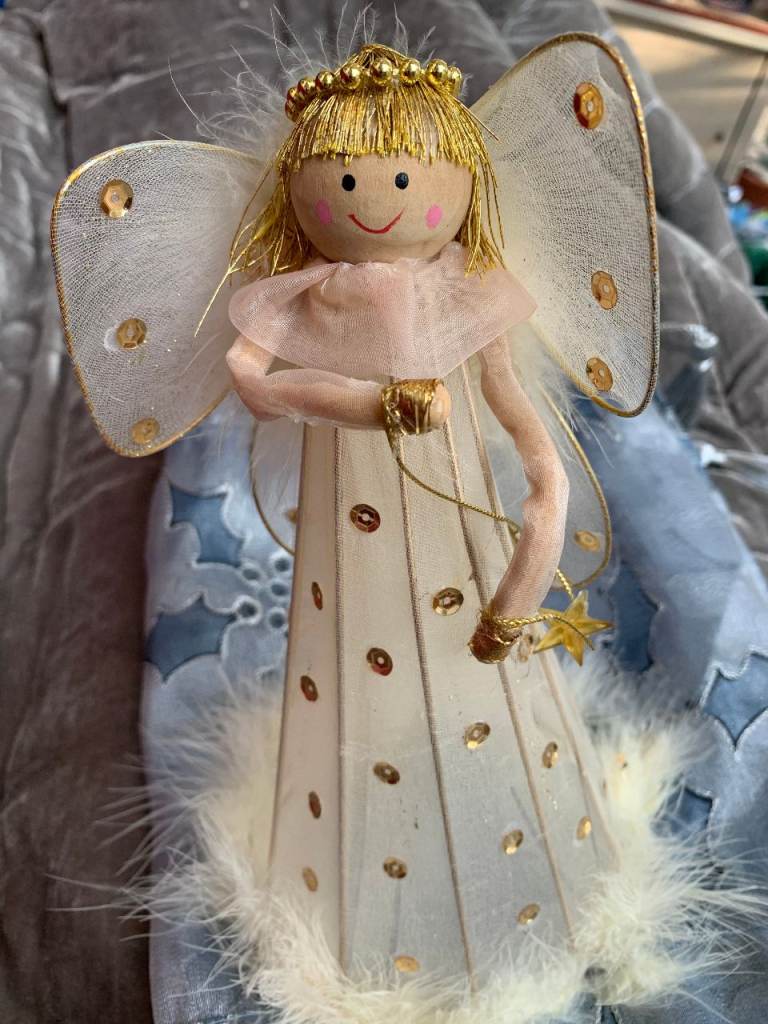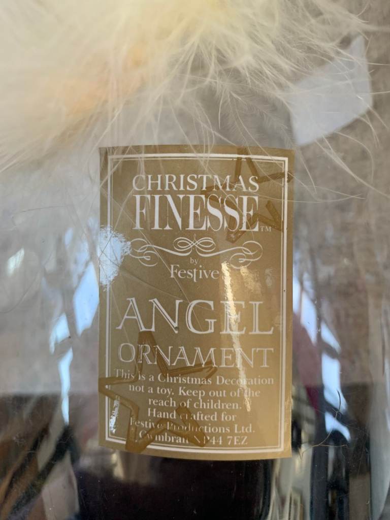 Christmas Angel Tree Topper Decoration, elegant cream gown detailed with gold glittered sequins, trimmed with real soft white feathers as well as the wings - So versatile that it can also be used as a table top decoration - Smiling friendly little wooden face, with golden hair - This is a vintage hand crafted decoration by Christmas Finesse (Festive Production Ltd, UK) in very good condition! - 25cm high -
