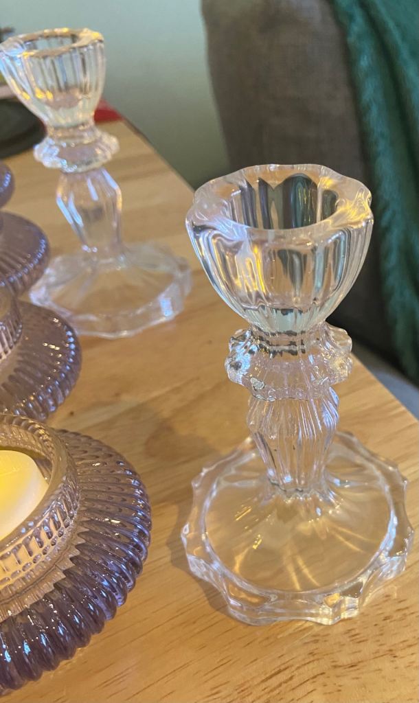 Beautiful, vintage style purple glass tea light holders plus taper candle holders.