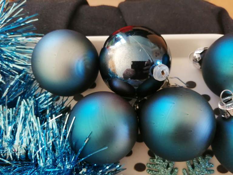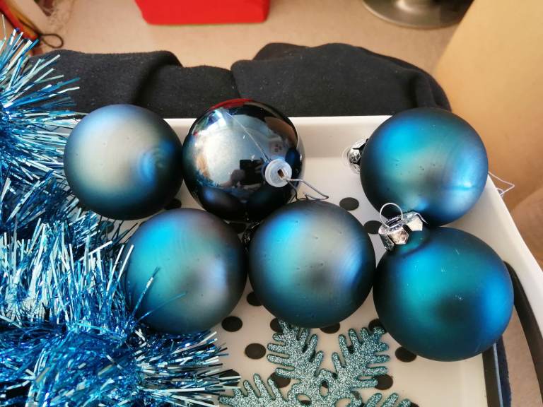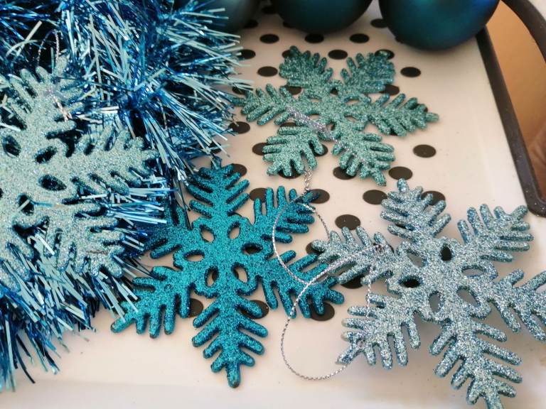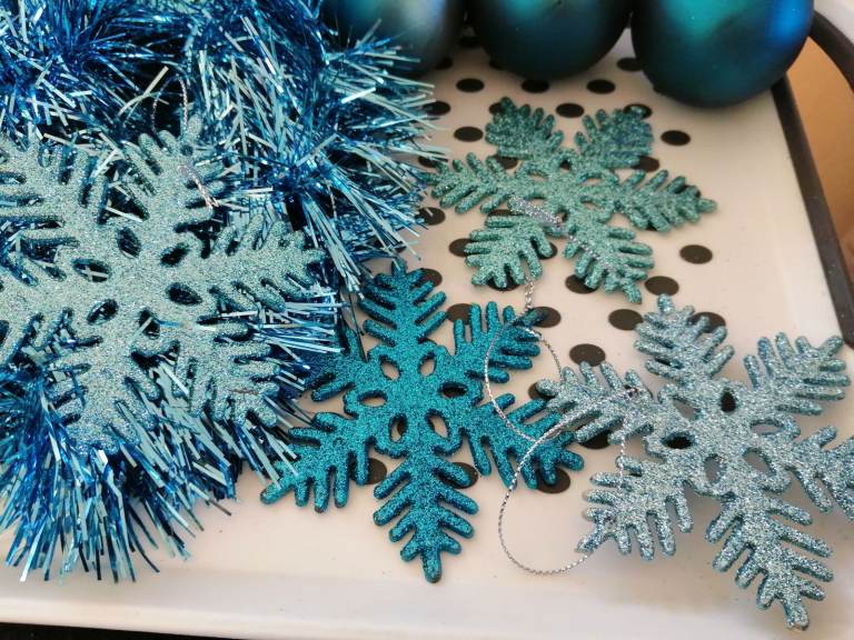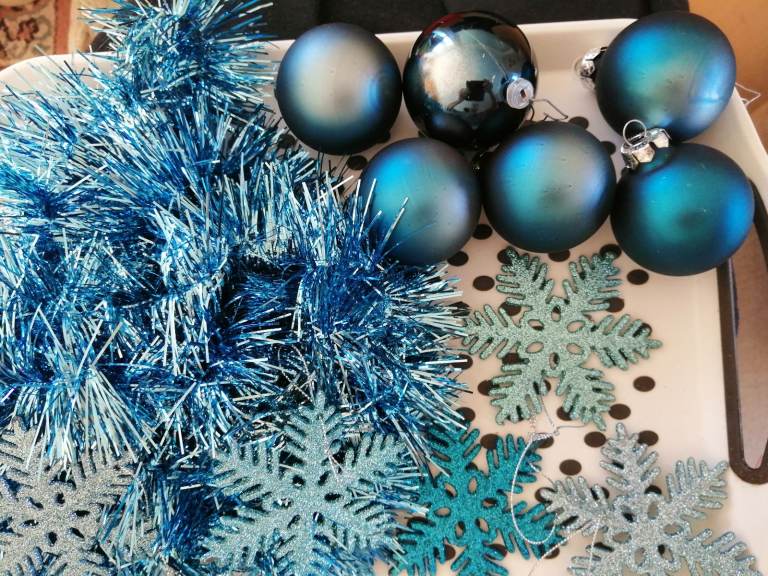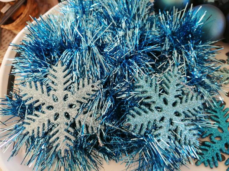 6 x 5cm blue baubles with 5 x 9cm blue snowflakes and blue tinsel 2 metres length
