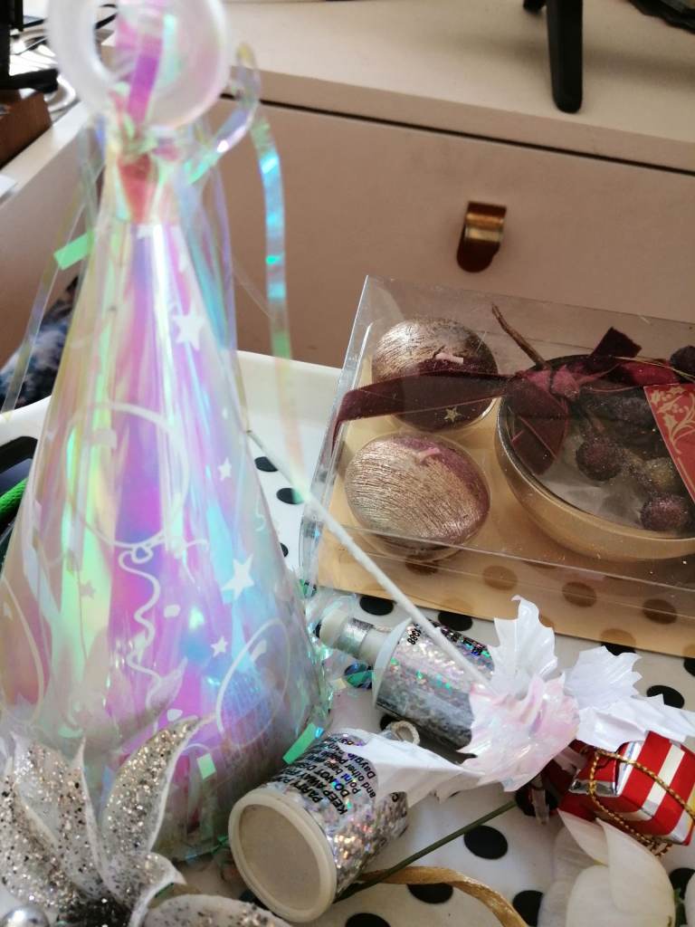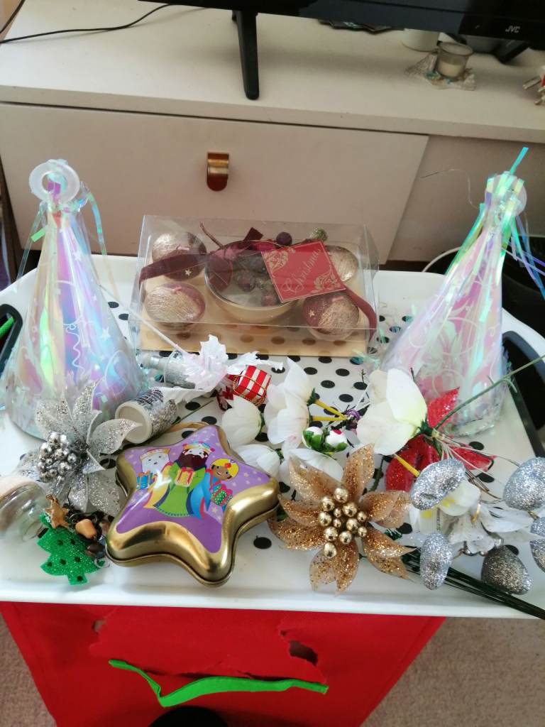 A collection of Xmas tree decorations including a gift box of 4 golden T lights + holder cup still in original packaging with gift tag.