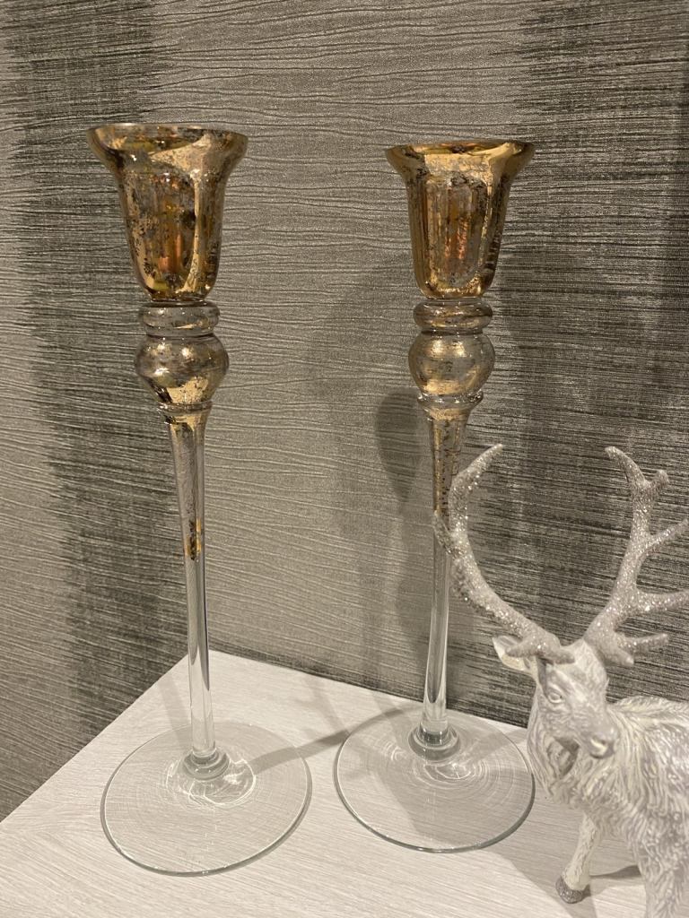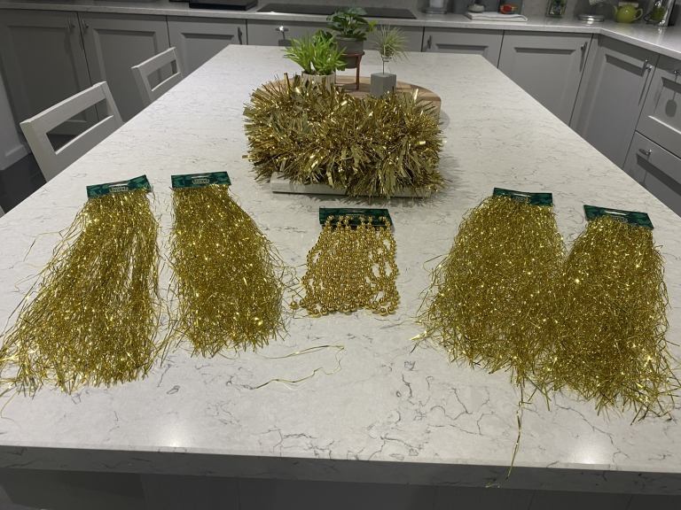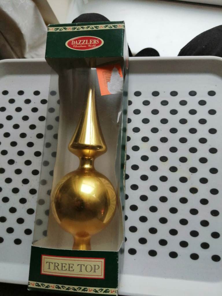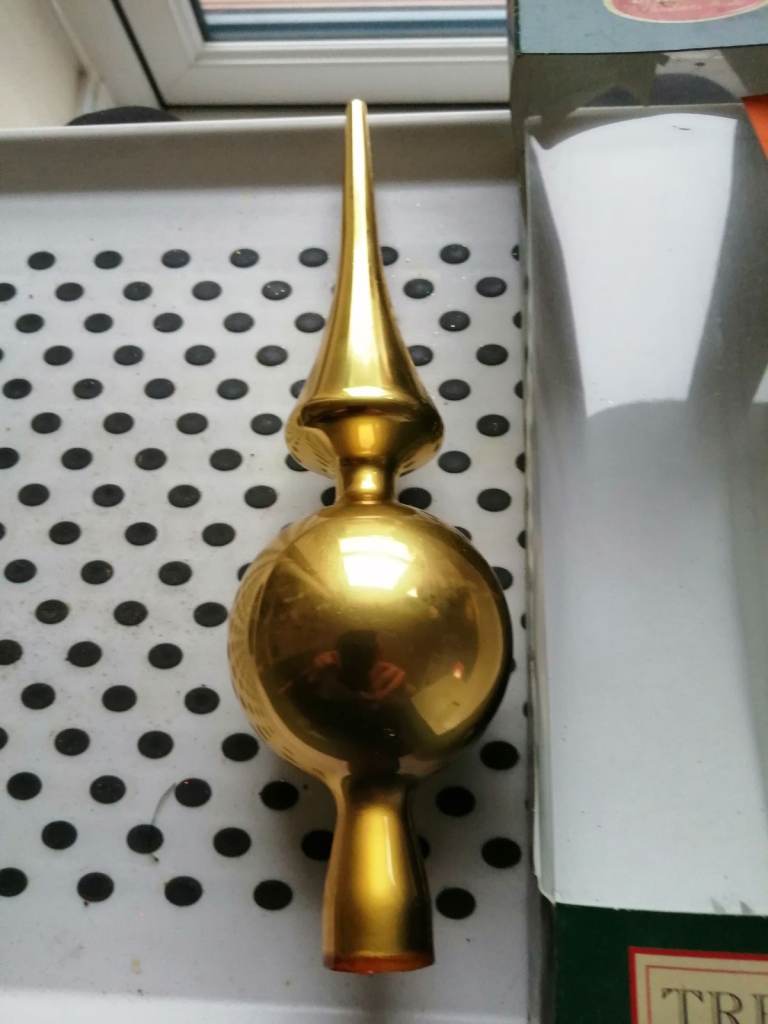 A golden Xmas tree top decoration carefully packed in the original boxed presentation. Both in good condition, no damage. Made by Dazzlers Christmas World. 25cm tall, 7.5cm width
