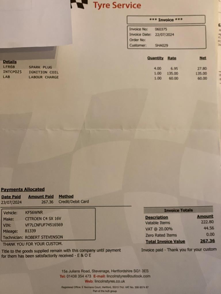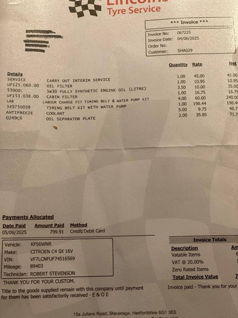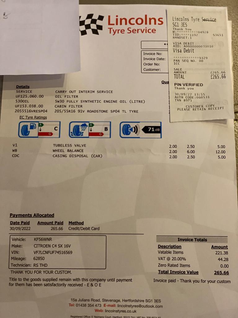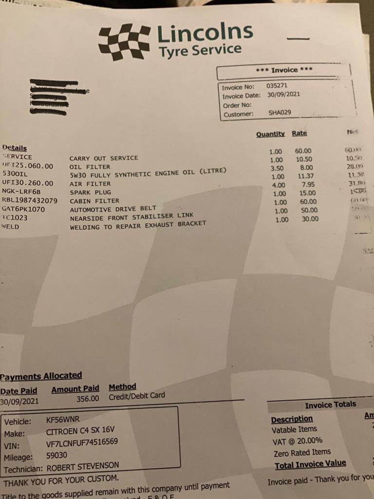 Citroen C4 SX 16V 1.6 Petrol (KF56WNR)1 OWNER FULL SERVICE HISTORY CAMBELT AND WATERPUMP CHANGEDGreat value Citroen C4 1.6 Petrol that drives well and comes with a strong maintenance record, including a recent timing belt + water pump replacement. Ideal reliable daily car with plenty of paperwork to support how its been looked after over the years.Drives wellGreat value motoringHuge history folderCambelt + Water Pump doneService invoices presentService History / Maintenance Record (Newest to Oldest)04/06/2025 89,403 miles TIMING BELT + WATER PUMP DONE Interim service carried out (oil + filter + cabin filter + 5W30 oil) Timing belt & water pump kit fitted Coolant / antifreeze Oil separator plate13/02/2025 85,909 miles 2 tyres fitted (205/55R16) + balancing/valves22/07/2024 81,339 miles Spark plugs replaced Ignition coil replaced22/11/2023 72,458 miles Service Oil & oil filter service 5W30 fully synthetic oil Air filter + cabin filter Spark plugs Bulb18/05/2023 Brake Work + Tracking (Invoice) Brake discs + pads fitted Tracking / alignment carried out Track rod ends30/09/2022 62,850 miles Interim Service + Tyres Interim service (oil + filter) Cabin filter 2 tyres fitted (205/55R16) + balancing/valves30/09/2021 59,030 miles Full Service + Repairs Oil & oil filter service 5W30 fully synthetic oil Air filter + cabin filter Spark plugs Auxiliary/drive belt N/S front stabiliser link Exhaust bracket repair (welding)19/01/2021 56,959 miles Front springs replaced (x2) Rear tyres fitted (x2) O/S top mount kit20062021 (8,00056,000 miles) Comes with a folder FULL of invoices/receipts dating back to early ownership, showing ongoing maintenance through the years.