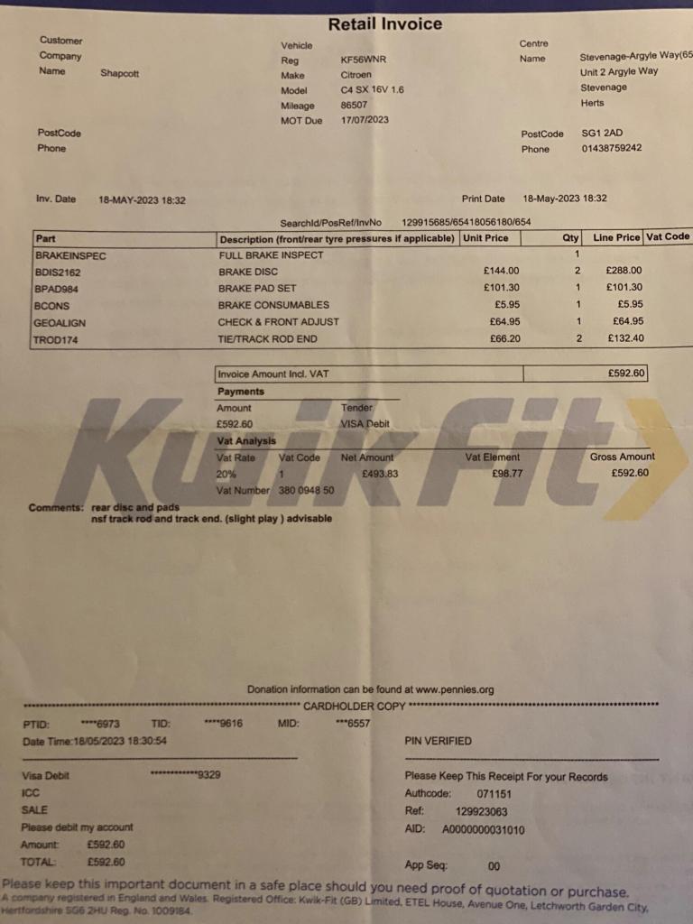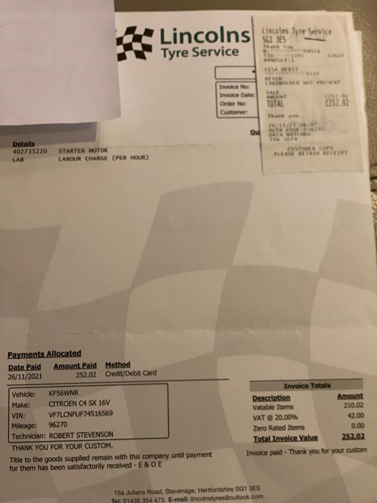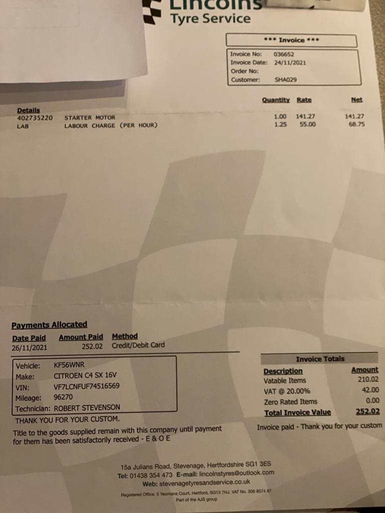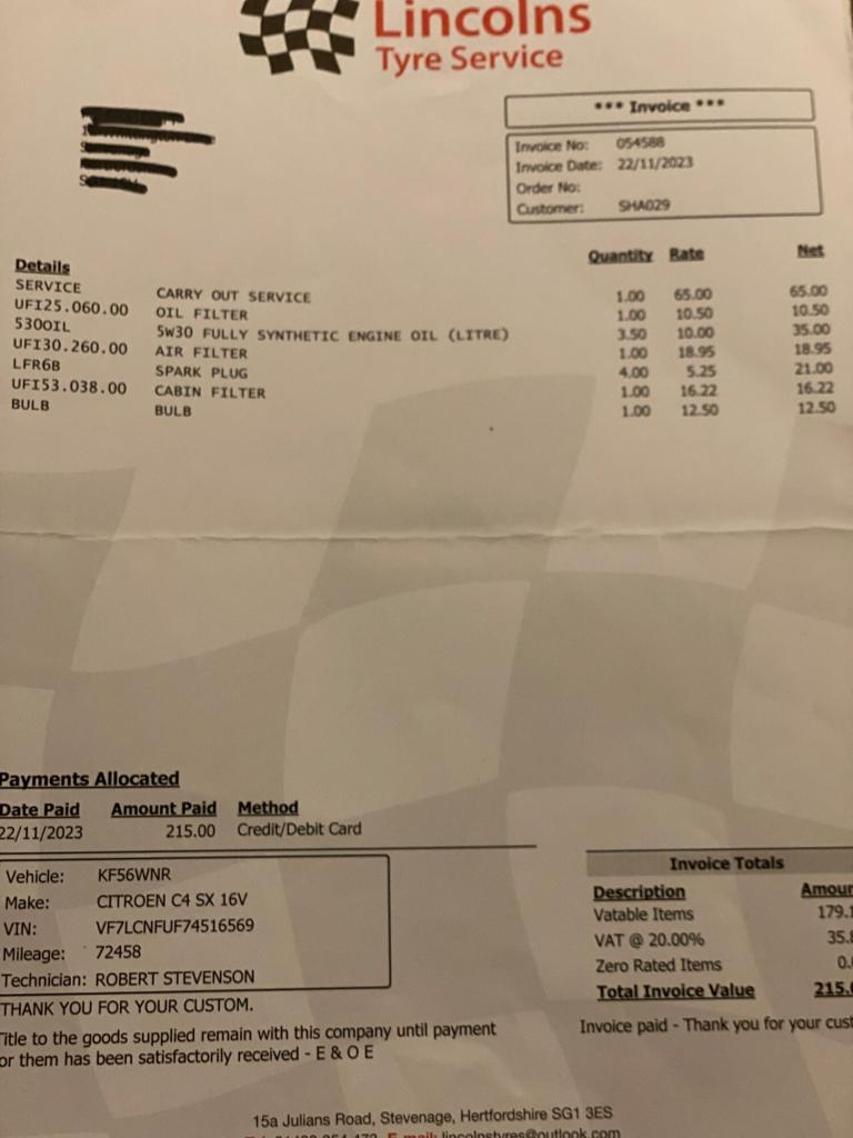 Citroen C4 SX 16V 1.6 Petrol (KF56WNR)1 OWNER FULL SERVICE HISTORY CAMBELT AND WATERPUMP CHANGEDGreat value Citroen C4 1.6 Petrol that drives well and comes with a strong maintenance record, including a recent timing belt + water pump replacement. Ideal reliable daily car with plenty of paperwork to support how its been looked after over the years.Drives wellGreat value motoringHuge history folderCambelt + Water Pump doneService invoices presentService History / Maintenance Record (Newest to Oldest)04/06/2025 89,403 miles TIMING BELT + WATER PUMP DONE Interim service carried out (oil + filter + cabin filter + 5W30 oil) Timing belt & water pump kit fitted Coolant / antifreeze Oil separator plate13/02/2025 85,909 miles 2 tyres fitted (205/55R16) + balancing/valves22/07/2024 81,339 miles Spark plugs replaced Ignition coil replaced22/11/2023 72,458 miles Service Oil & oil filter service 5W30 fully synthetic oil Air filter + cabin filter Spark plugs Bulb18/05/2023 Brake Work + Tracking (Invoice) Brake discs + pads fitted Tracking / alignment carried out Track rod ends30/09/2022 62,850 miles Interim Service + Tyres Interim service (oil + filter) Cabin filter 2 tyres fitted (205/55R16) + balancing/valves30/09/2021 59,030 miles Full Service + Repairs Oil & oil filter service 5W30 fully synthetic oil Air filter + cabin filter Spark plugs Auxiliary/drive belt N/S front stabiliser link Exhaust bracket repair (welding)19/01/2021 56,959 miles Front springs replaced (x2) Rear tyres fitted (x2) O/S top mount kit20062021 (8,00056,000 miles) Comes with a folder FULL of invoices/receipts dating back to early ownership, showing ongoing maintenance through the years.