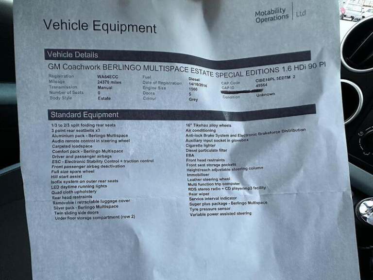 Radio - RDS with CD and MP3 Player, Audible Lights On and Key in Ignition Warning, Coolant Indicator, Digital Clock, Handbrake Warning Light, Indicator Warning Light, Multi-Function On-Board Trip Computer, Rev Counter, Side Headlights and Main Beam Warning Lights, 16in Alloy Wheels - Tikehau, Body Coloured Door Mirrors, Electric Windows - Front with One Touch Operation, Laminated Windscreen, Lockable Fuel Cap, Tailgate, Tilt Opening Windows in Row 2 and Fixed Windows in Row 3, Front Fog Lights, Headlights - Height Adjustable, High Level Third Brake Light, LED Daytime Running Lights - DRLs, Air Conditioning, Automatic Illumination of Cabin Lighting via Ceiling Mounted Button, Carpeted Boot, Cigarette Lighter, Comfort Pack, Glove Box - Lidded in Dashboard, Head Restraints - Front Height Adjustment, Height and Reach Adjustable Steering Wheel, Height-Adjustable Driver Seat, Leather Steering Wheel, Rear Head Restraints, Retractable and Removable Luggage Cover, Steering Wheel Mounted Controls, Storage - Front Seat Back Pockets, Sunvisors - Front, Twin Sliding Side Doors - Glazed, Two Speed Intermittent Front Windscreen Wipers, Underfloor Compartments in Row 2, Variable Power Assisted Steering, ABS - Anti-Lock Braking System, Airbags - Driver, Automatic Activation of Hazard Warning Lights, Deadlocks, EBFD - Electronic Brakeforce Distribution, Electric Child Locks, Fuel Cut-off Device, ISOFIX - Child Seat Anchorage Points - Outer Rear, Super Plus Pack, Transponder Immobiliser, Airbags - Front Passenger with Cut-Off Device, Armrest - Front, Black Pack, EBA - Electronic Brake Assistance, Electrically Adjustable Heated Door Mirrors, Oynx Black Side Mirrors, Oynx Black Side Rubbing Strips, Remote Central Locking with Deadlocks, Seat Belt Unfastened Warning - Driver, Seats - Split Folding Tiltable and Removable Row 2 Bench, Spare Wheel - Steel, Storage Drawer Under Drivers Seat.AIRCONDITIONING - BLACK PACK - COMFORT PACK - HEATED DOOR MIRRORS - FRONT FOGS - ISOFIX SEATS - LED DAYTIME RUNNING LIGHTS - SUPER PLUS PACK - UNDER FLOOR COMPARTMENTS - STEERING WHEEL MOUNTED CONTROLS - TWIN SLIDING SIDE DOORS - TAILGATE - ABS, WHEEL CHAIR ACCESSIBLE VEHICLE!Low rate finance available with no deposit necessary - Part exchange welcome - 3 months free warranty with the option to extend to 12 or 24 months - GOOD SERVICE HISTORY WITH RECORD OF 2015, 2016, 2017, 2018, 2019, 2020, 2021 AND WITH A SERVICE AND MOT TO BE PERFORMED PRIOR TO SALE! Please get in touch to request a PERSONALISED VIDEO and to check availability before travelling to avoid disappointment. This car is AVAILABLE TO VIEW 7 DAYS A WEEK.All of our cars are offered with a COMPLIMENTARY MULTI-POINT SAFETY INSPECTION prior to leaving site as standard practice ensuring you can buy with confidence.