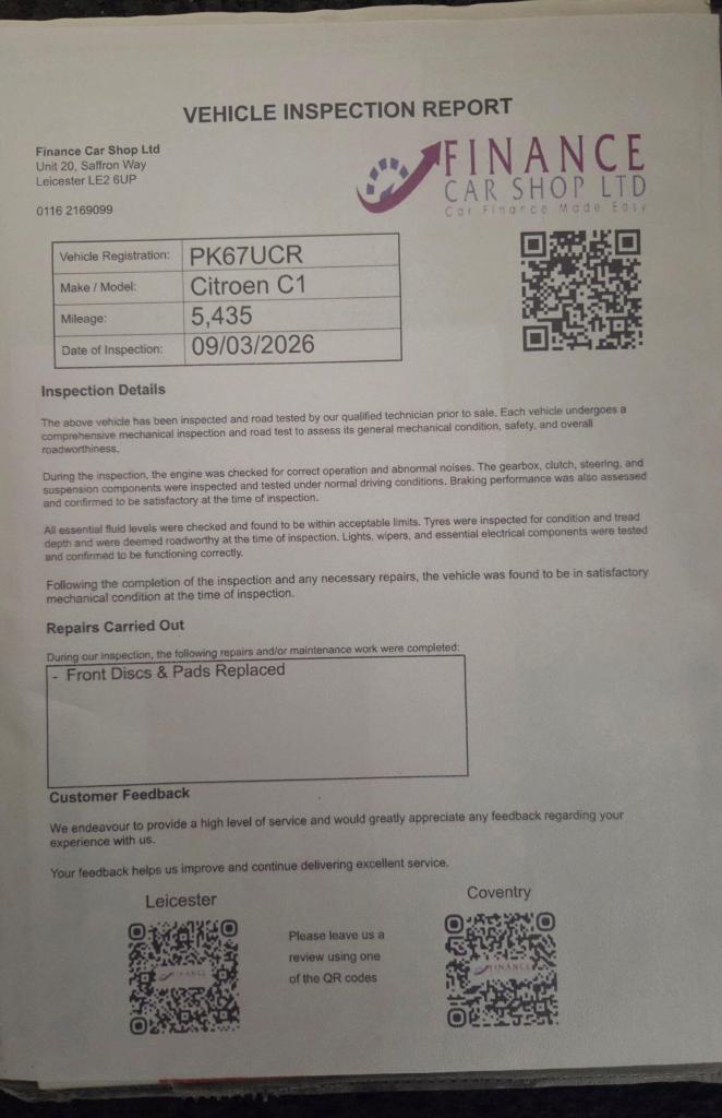 Citroën C1 1.0 VTi Feel Euro 6 – Low Mileage, Full Service History, 1 Former KeeperFor sale is a Citroën C1 1.0 VTi Feel Euro 6, a compact and economical city car, ideal for first-time drivers, commuters, or anyone looking for a reliable and low-cost car to run.This vehicle has low mileage, a full service history, and has had only 1 former keeper, demonstrating that it has been well maintained. The efficient 1.0 petrol engine delivers excellent fuel economy and is easy and comfortable to drive.Key Features1.0 Petrol EngineFeel TrimEuro 6 – ULEZ CompliantLow MileageFull Service History1 Former KeeperAir ConditioningElectric Front WindowsRemote Central LockingPower SteeringTouchscreen Infotainment SystemBluetooth ConnectivityUSB / AUX InputThe car drives perfectly and is clean inside and out for its age.Perfect for city driving, new drivers, or anyone wanting a reliable, economical, and low-maintenance car.+ LOW MILEAGE + FULL SERVICE HISTORY + 1 FORMER KEEPER + 6 MONTHS WARRANTY INCLUDED + 6 MONTHS BREAKDOWN COVER + EXTENDED WARRANTY AVAILABLE + FINANCE OPTIONS AVAILABLE UPON REQUEST + DELIVERY CAN ONLY BE ARRANGED ONCE THE VEHICLE HAS BEEN VIEWED & INSPECTED IN PERSON AT OUR PREMISES + PHOTO ID IS REQUIRED FOR ALL VIEWINGS AND TEST DRIVES + WE CAN BE REACHED VIA WHATSAPP ON [Phone number removed] – FEEL FREE TO MESSAGE US + PLEASE NOTE, THE PRICE IS FIXED ON THIS VEHICLE. KINDLY BE AWARE OF THIS PRIOR TO ARRANGING A VIEWING + WE HAVE OVER 50 VEHICLES IN STOCK. AS NOT ALL VEHICLES ARE HELD ON SITE, PLEASE ENSURE YOU CALL IN ADVANCE BEFORE MAKING YOUR JOURNEY + BANK TRANSFER ONLY + MORE CARS AVAILABLE AT:WWW.FINANCECARSHOPLTD.CO.UK +