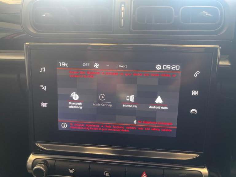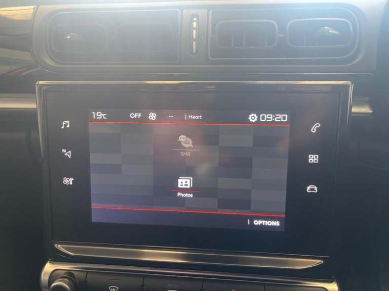 Alarm, Automatic air conditioning, Carpet mats, Immobiliser, Locking wheel nuts, Rear wiper, Remote central locking + deadlocks, Rev counter, Height/reach adjust steering wheel, Cloth upholstery, Space saver spare wheel, Height adjustable driver's seat, Body colour bumpers, Front seat and rear pockets, Height adjustable front headrests, Wheel arch extensions, Three height adjustable rear head restraints, Front cupholders x 2, Electronic stability control, Lashing eyelets in boot, Rear cupholder, Cruise control + speed limiter, Split folding rear seats, Front seatbelt pretensioner, Boot light, Rear parking sensor, Electric front windows + one touch + anti-pinch, Steering wheel mounted audio controls, Electric adjustable/heated/folding door mirrors, Electric rear windows + anti-pinch, Lane departure warning system, Tyre pressure monitor, Auxiliary input socket, LED daytime running lights, Electric child locks, Forward collision warning, Traffic sign recognition, Satin chrome steering wheel inserts, 7 colour touch screen, Urban red ambiance pack - C3, Coffee Break Alert, Technology pack - C3, Mirror screen with mirror link, apple carplay and android auto, Exterior temperature display, ABS with Electronic brakeforce distribution and Emergency braking assistance, Gear efficiency indicator, Airbags - Driver/front passenger, front lateral and curtain, Front courtesy reading lights, Hill start assist function, Speed limit recognition and speed warning, Variable assistance power steering,